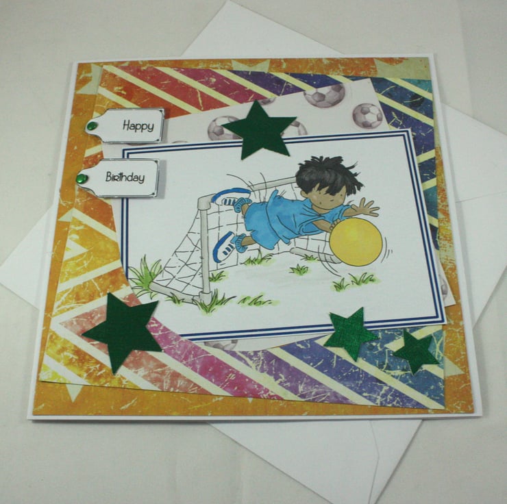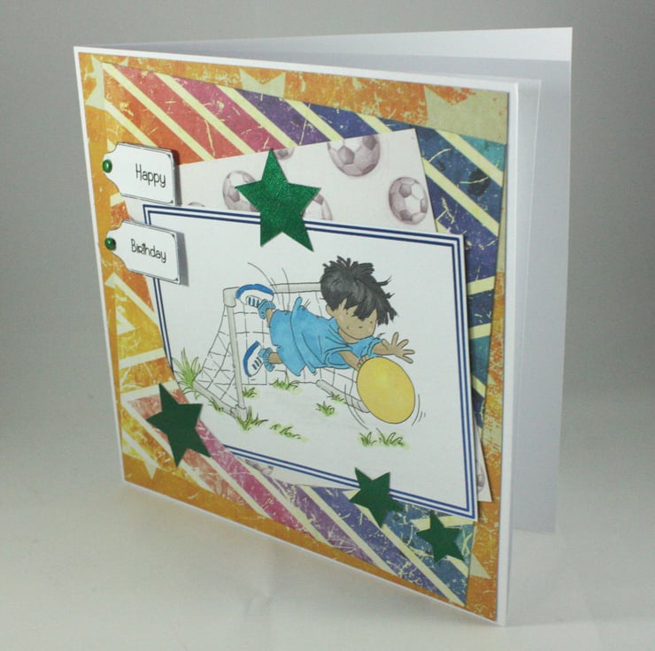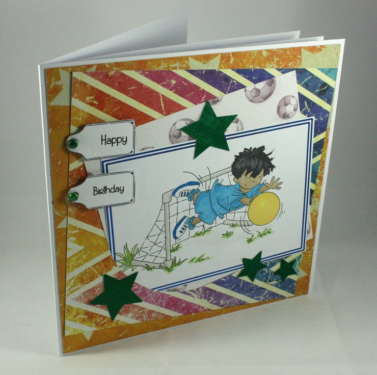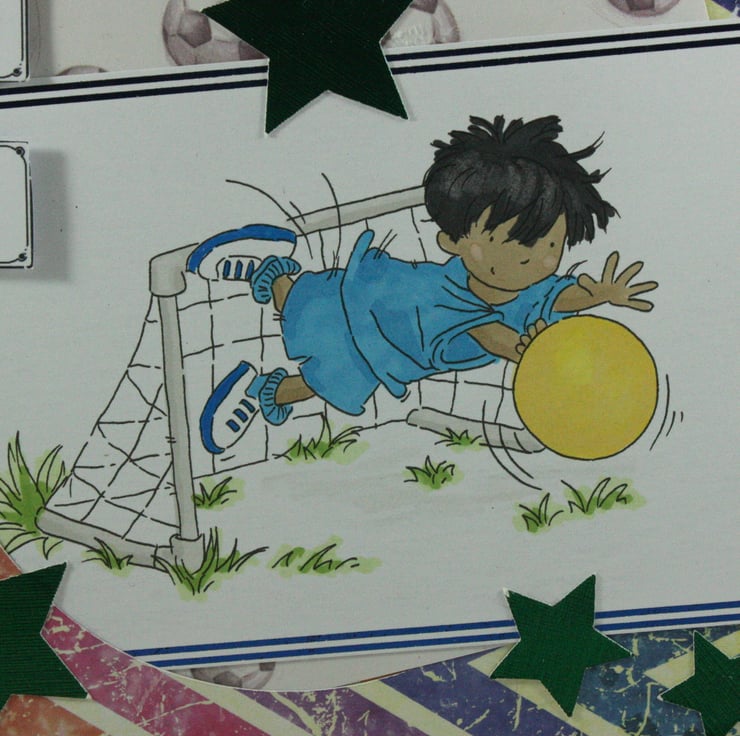 Large, square birthday card featuring a hand coloured image of a little boy diving to save a football. The image has been edged with blue foil and is overlaid onto multiple bright coloured background papers and embellished with green, die cut stars.