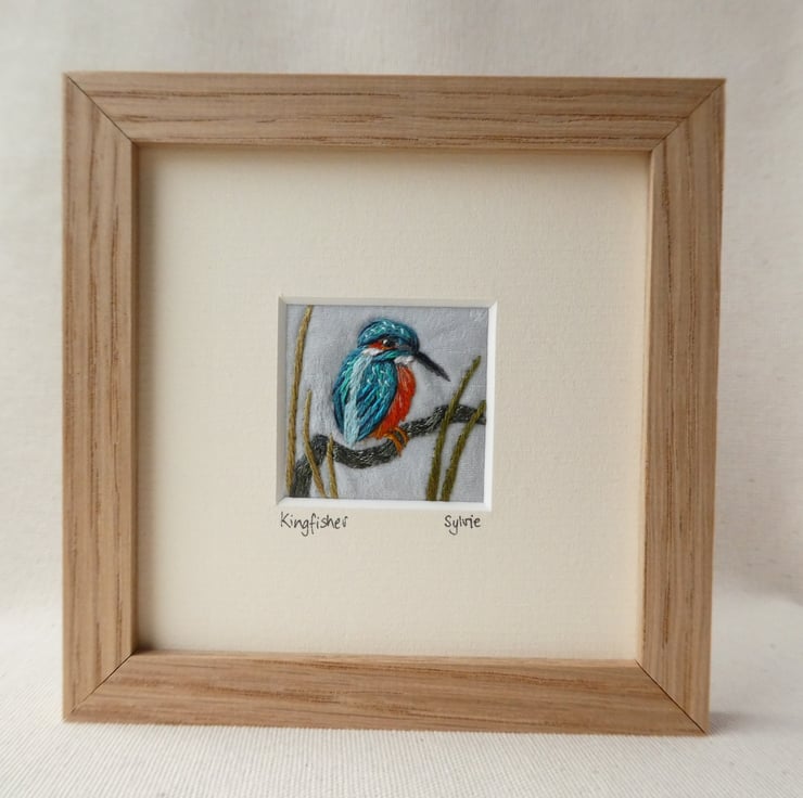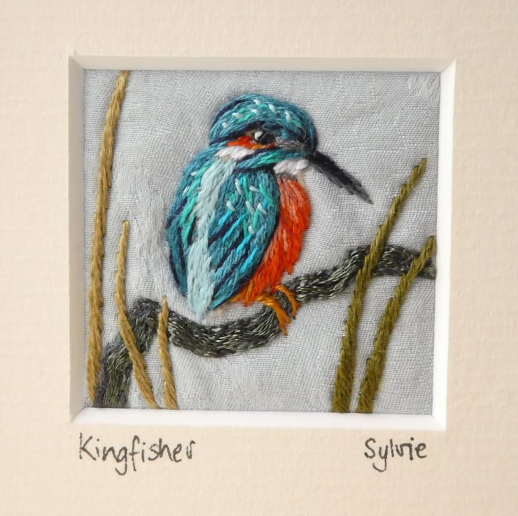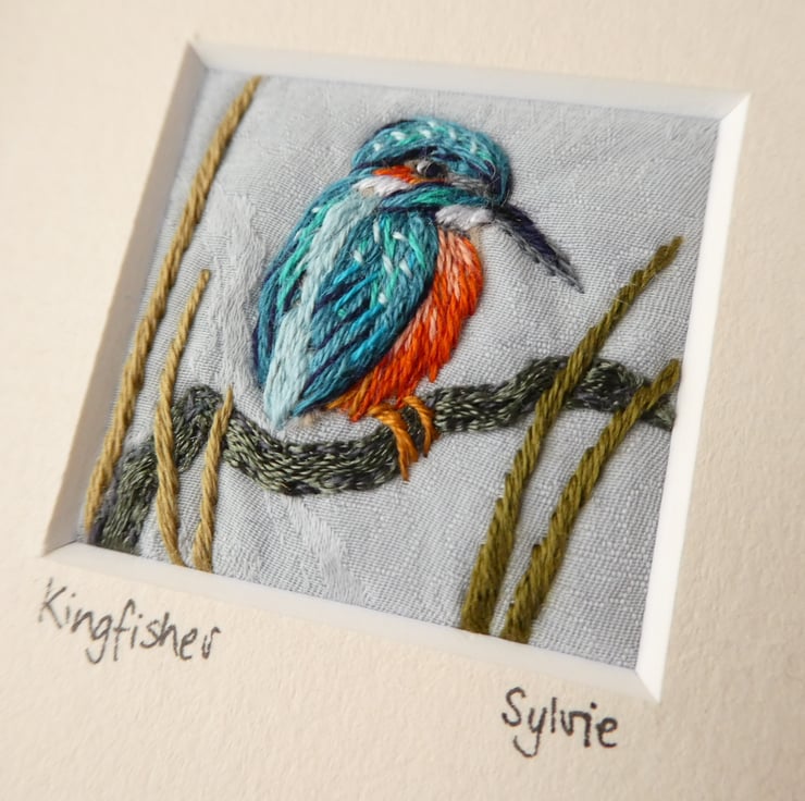 This little study has been carefully stitched by hand with strands of embroidery threads, using stitches of various lengths and colours to build up depth and detail. It was stitched onto a background of a silky blue fabric that I salvaged from our wardrobe, and I used a satin ribbon to form the knarled branch he's resting on.