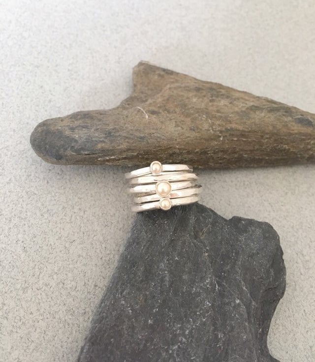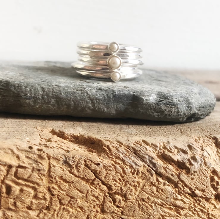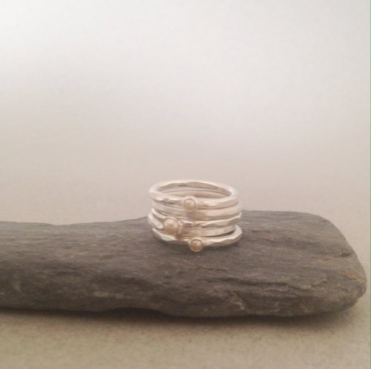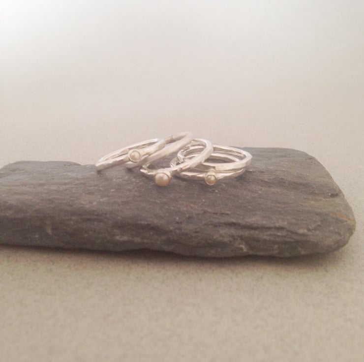 This listing is for a set of lovely crystal pearl stacking rings. The bands and setting are made of solid sterling silver and they are hammered to give a very artisan/rustic look. They are delicate and pretty -- and very practical. They can be mixed and matched with other stacking rings to create your own design.
