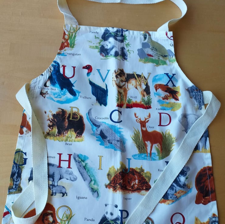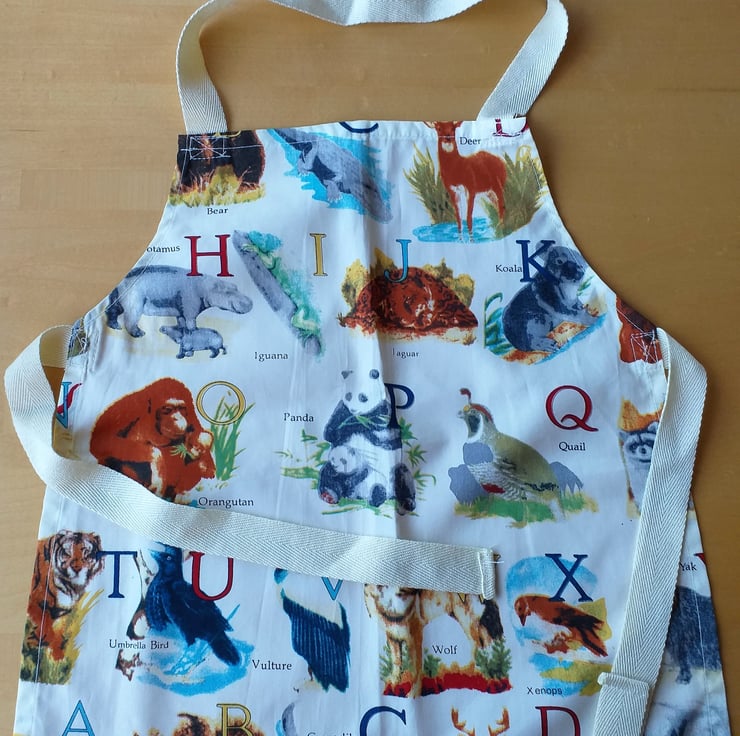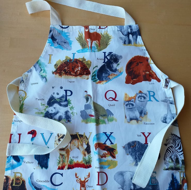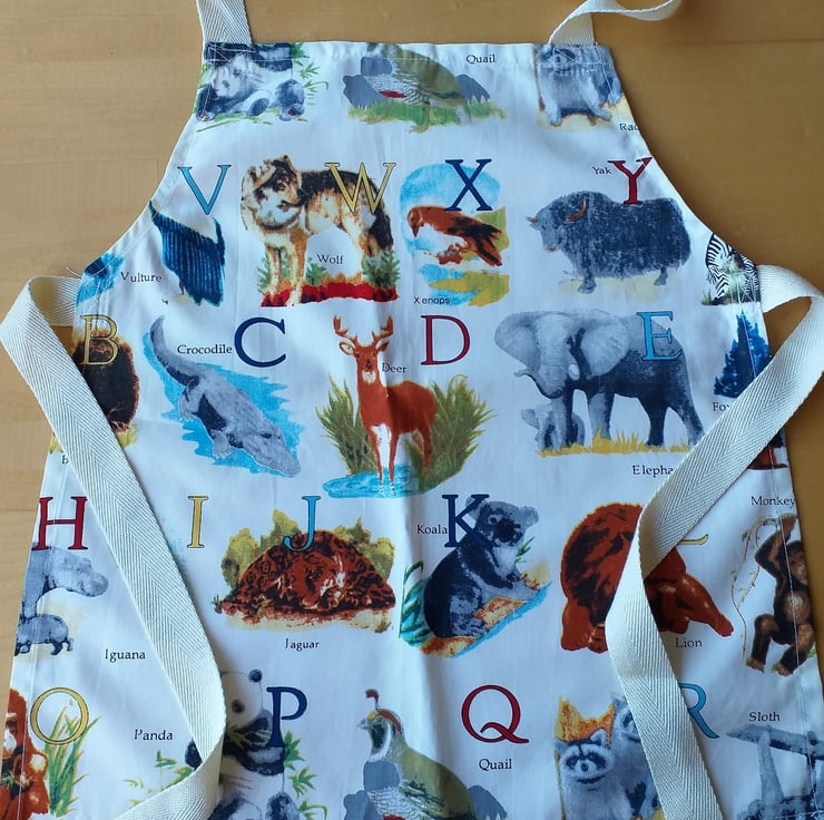 This pretty little pinny has pictures of zoo animals next to their name and upper case initial letter. Although they are shown in alphabetical order, not all letters feature on any apron. The apron is in my bargain basement section because there is a slight slip in the printing, giving some of the animals a rather soft focus appearance. I have made it of a good quality machine washable cotton, with acrylic webbing straps. It measures approximately 17" (43 cm.) from neck to hem, and 14" (36 cm.) at the widest point, and will fit a child from about 2-6 years. The child, wearing a different apron in the photo, is three years old.