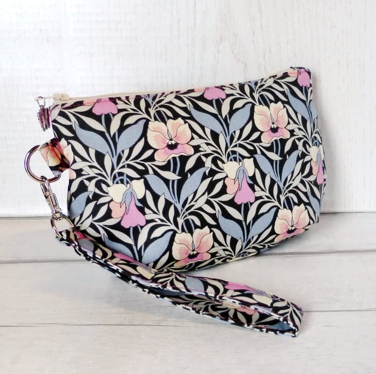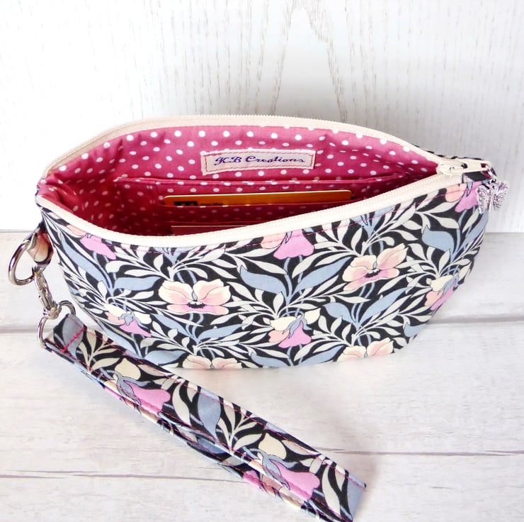 A small clutch bag made Liberty 'Harriet's pansy' from their new 'Hesketh House' range of quilting weight cotton, in shades of grey and pink. The lining fabric is dusky pink colour cotton with white spots on it. There ia a slip pocket inside with 3 card slots.