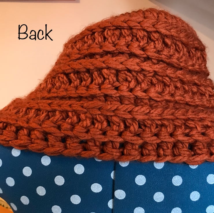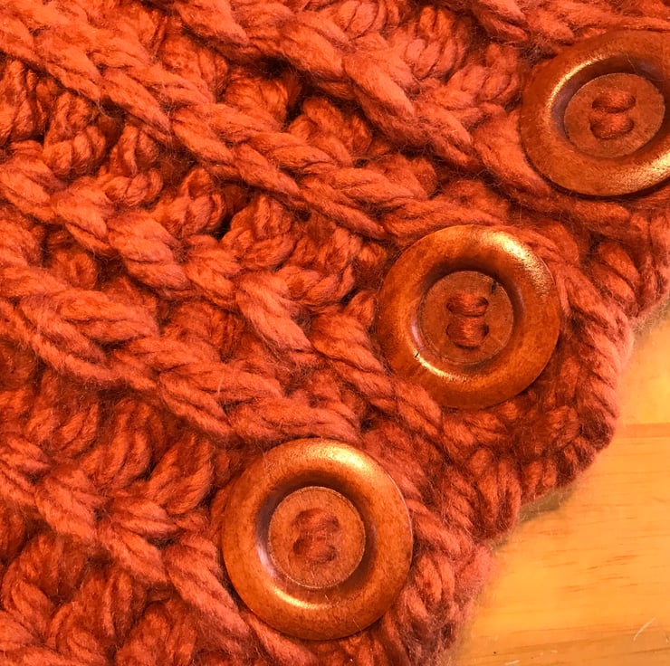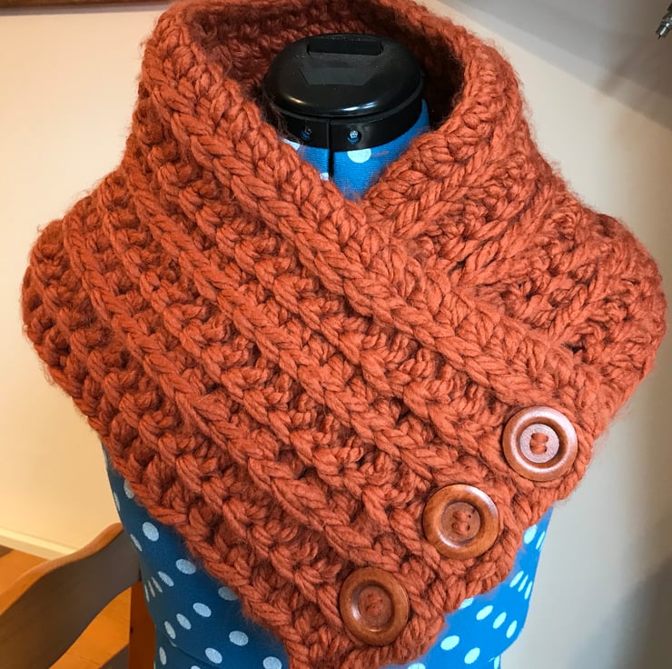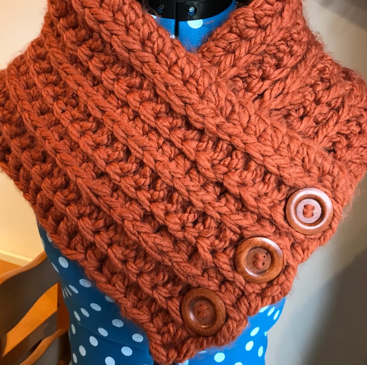 Super chunky crochet snood with three button detailing. Burnt orange colour which is simply stunning. 50% nylon 50% acrylic.