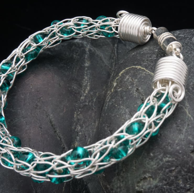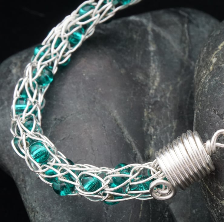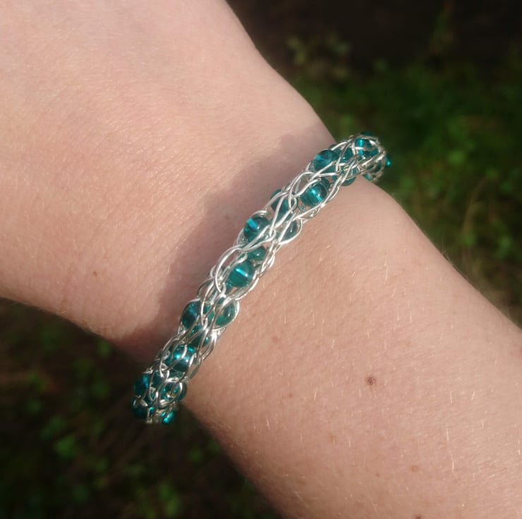 This gorgeous bracelet has been made with silver plated copper wire using the Viking knit technique. I've added 4mm turquoise glass seed beads into the chain at intervals - these larger beads have produced a beautiful effect, filling the chain with beads which complement the silver colour perfectly.