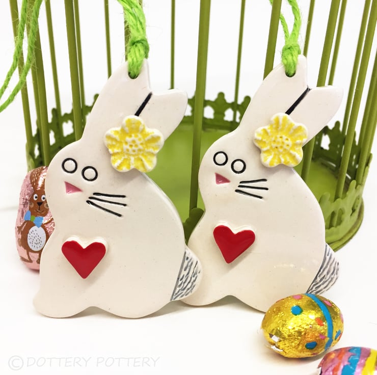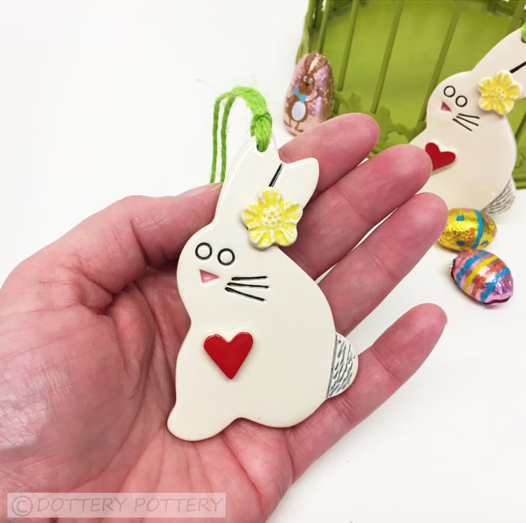 This cute little pottery Easter bunny decoration is cut from white earthenware clay, fired once, a rich glossy clear glaze is applied and it is then fired again - so it is nice and strong. This is the price for ONE bunny. The bunny measures 8.5cm x 5cm and hangs from a bright;y coloured string. It is glazed on the front and left plain on the back.