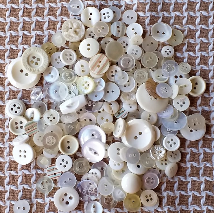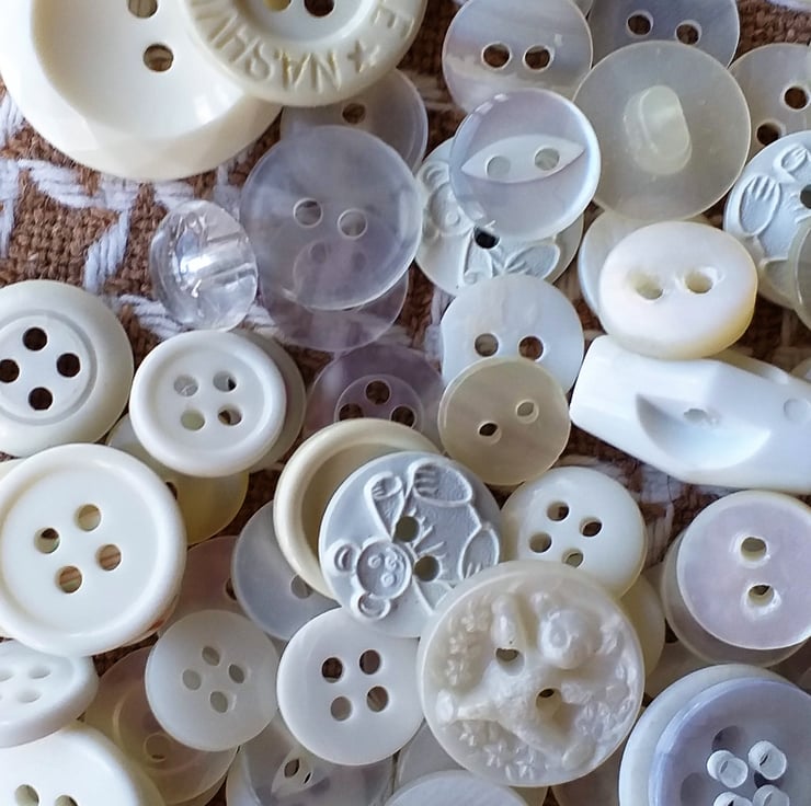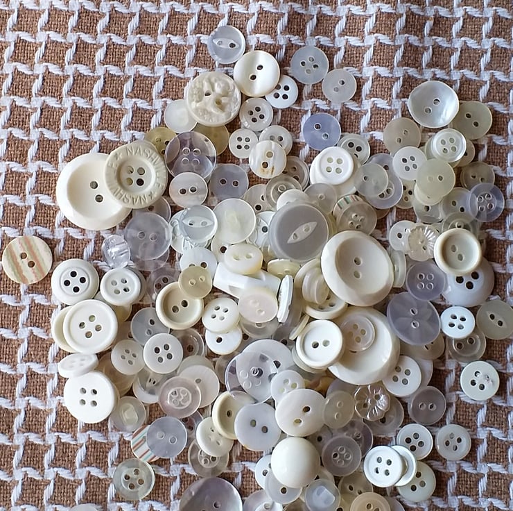 An assortment of white, cream and clear buttons, two hole, four hole and shank. Includes some very old mother of pearl buttons. Weighs approximately 60 gram.