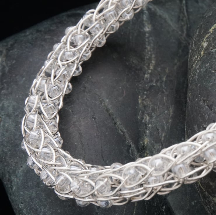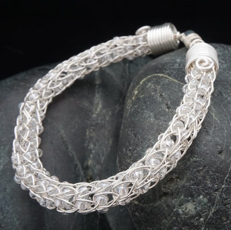 This elegant bracelet has been made with silver plated copper wire using the Viking knit technique. I've added glass seed beads into every loop of the chain - the beads are clear but with a translucent lustre finish - really picking up the silver colour & creating a gorgeous effect for a stunning, classic piece of jewellery. The single knit method produces an open, looser chain with quite a bit of movement to it compared to the double knit bracelets.