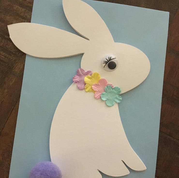 The white bunny is decorated with an eye a spring coloured collar and a coloured pom Pom tail.