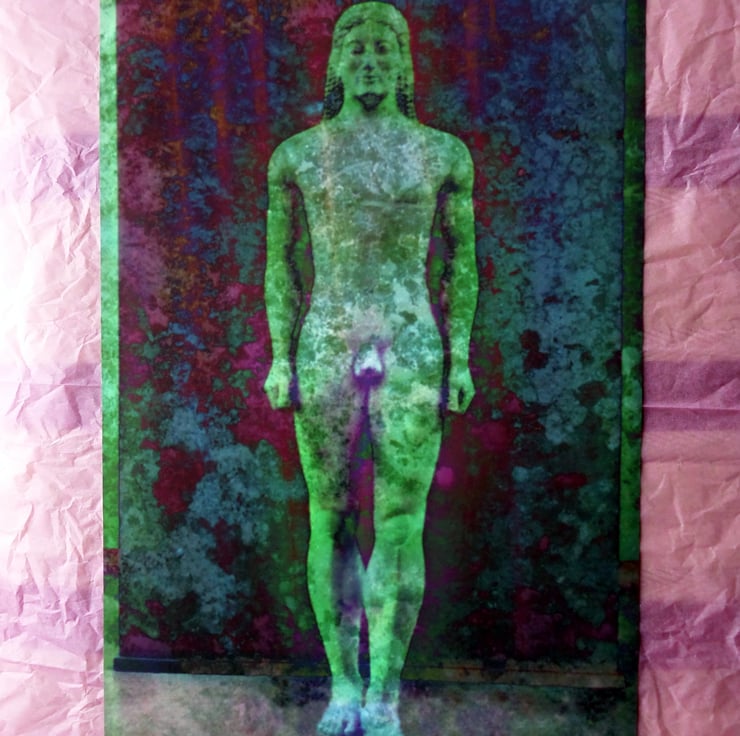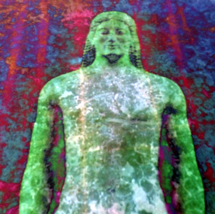 A Kouros is a stylised statue of a youth and this Anavyssos style was used as a grave marker for a fallen warrior. This image was created using various digital processes from one of my original photographs. The statue itself can be found in the National Archaeological Museum, Athens.