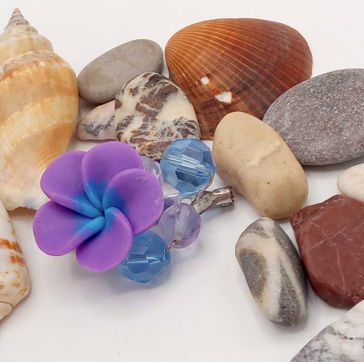 - a purple polymer clay flower with a blue centre with blue and lilac faceted round beads threaded on to a silver plated brooch back using silver plated craft wire.