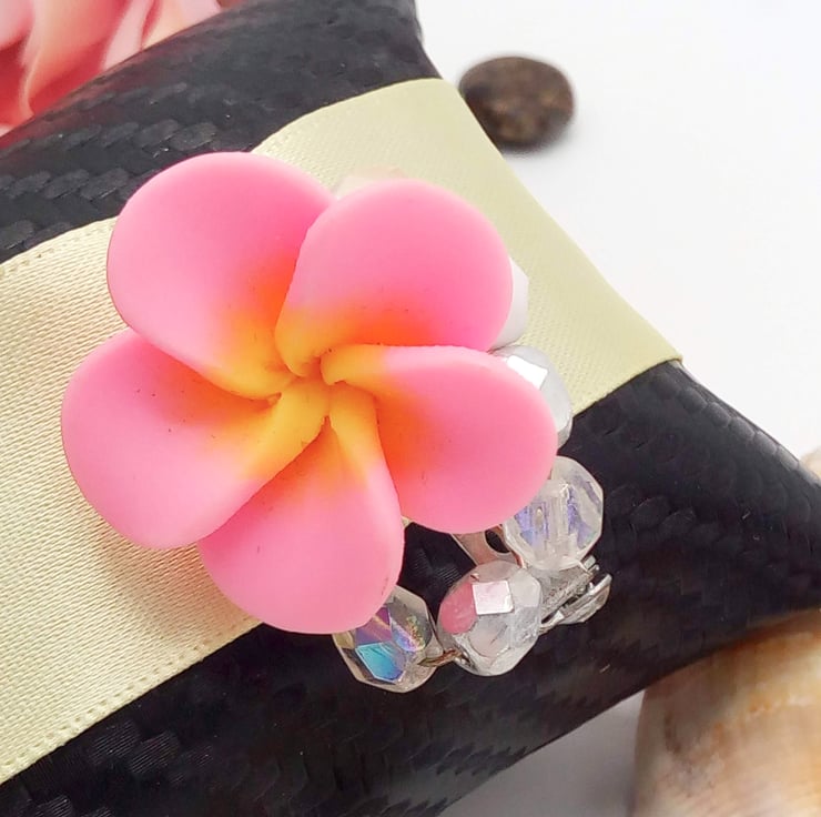 - a pink polymer clay flower with a yellow centre with silver and white faceted beads threaded on to a silver plated brooch back using silver plated craft wire , OR