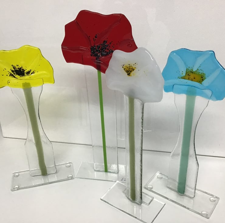 Freestanding fusedglass poppy made to order in a variety of colours red yellow blue and white . Perfect addition to your windowsill or mantle piece .