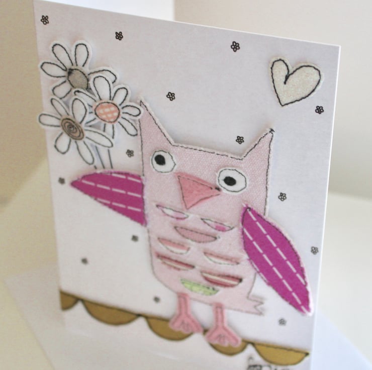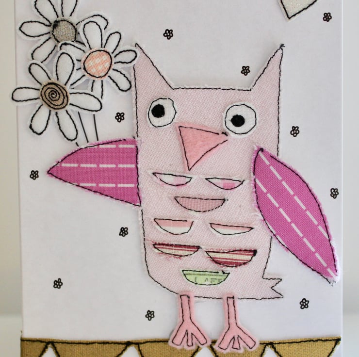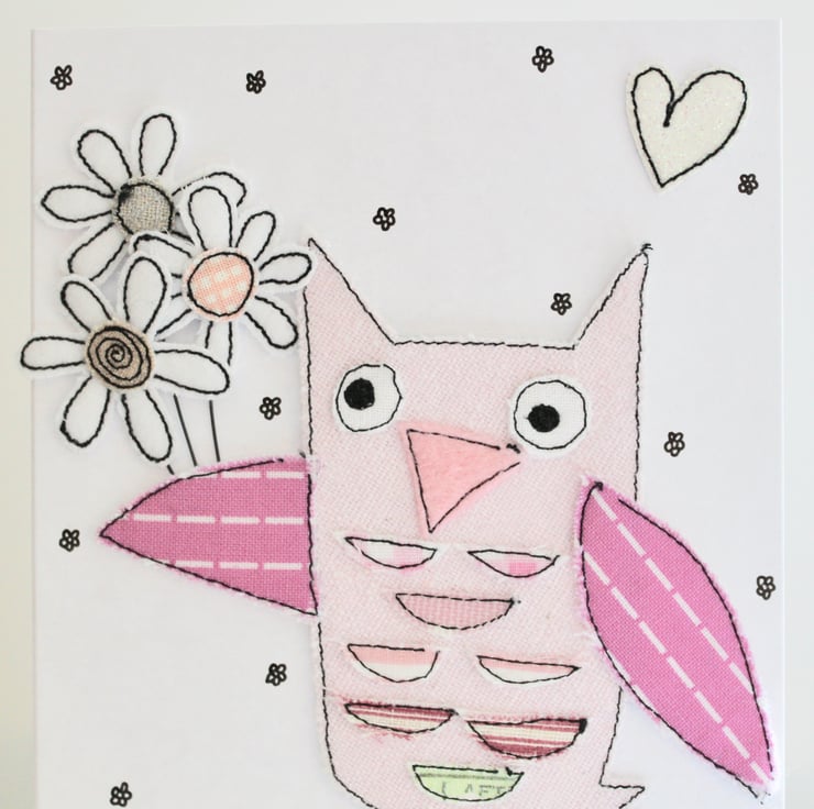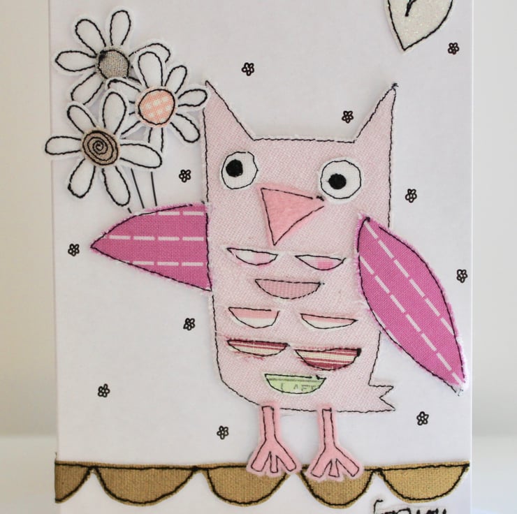 Little owl is clutching three blooms, with a sewn fabric label 'for you' and hand drawn flowers all around. A beautiful card to keep and treasure.
