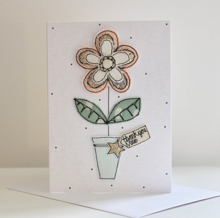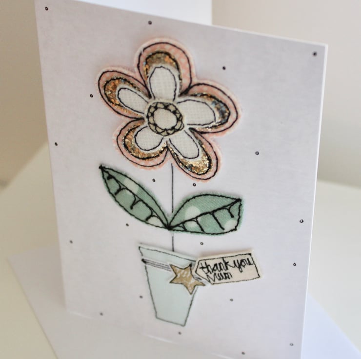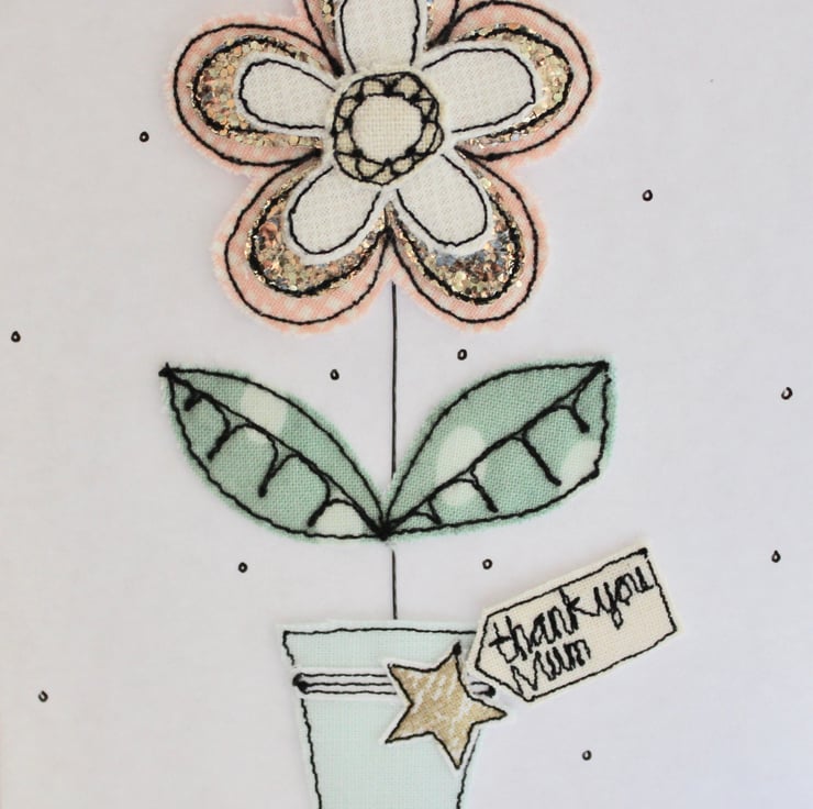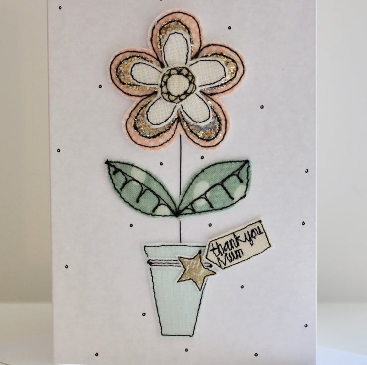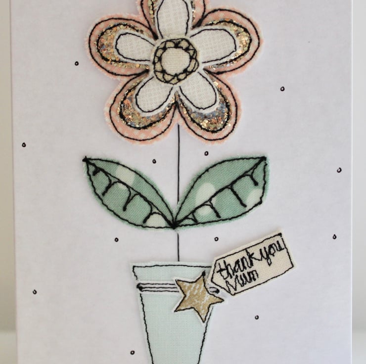 A bloom is growing in a little flowerpot, with a star, a sewn fabric label 'thank you Mum' and hand drawn bubbles all around. A beautiful card to keep and treasure.