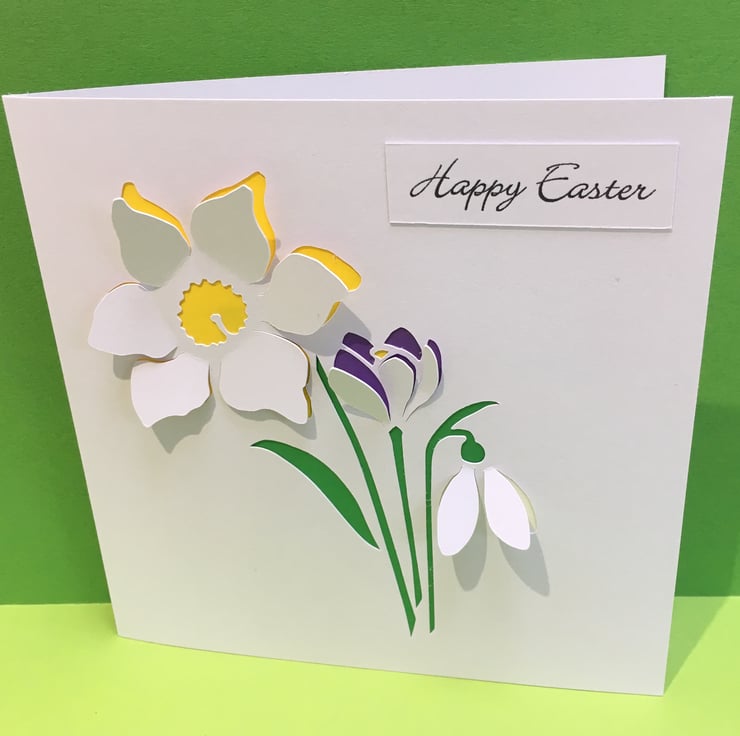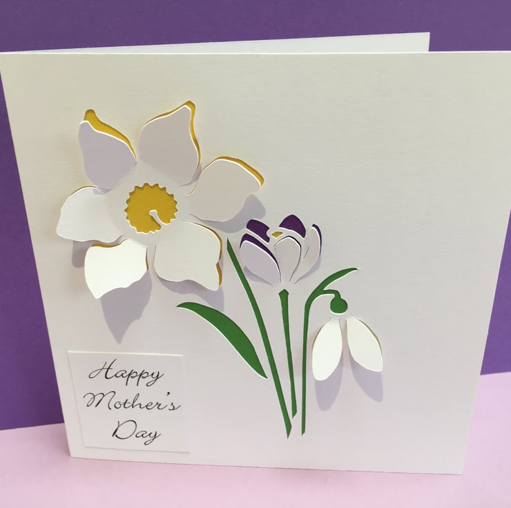 These pretty paper cut spring flowers make a unique card for Mother's Day or for any other occasion, with a beautiful daffodil, purple crocus and a snow drop. Simple and stunning.