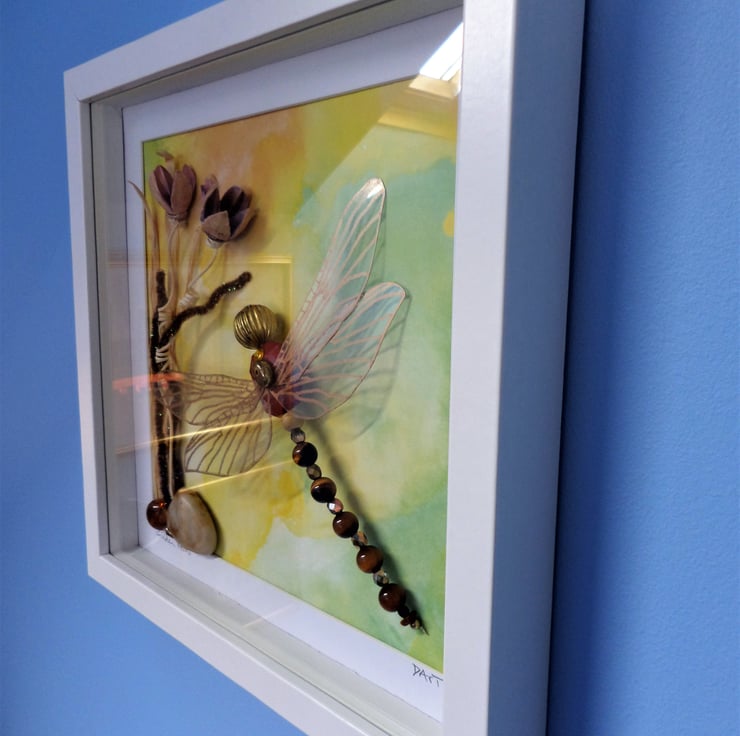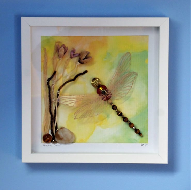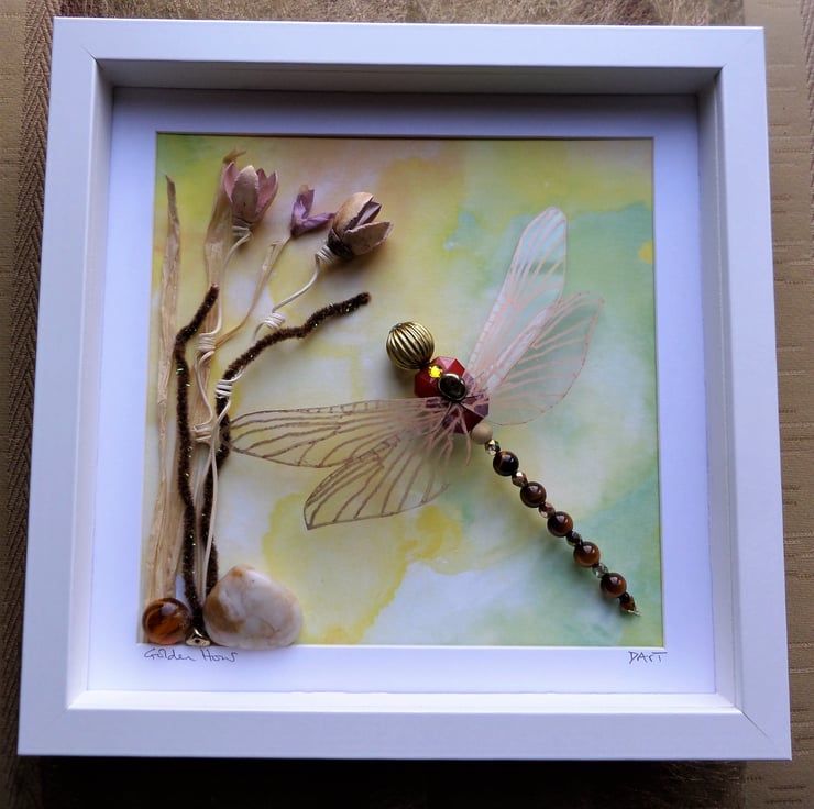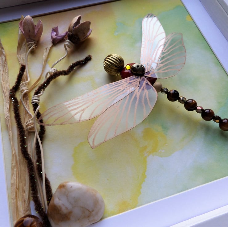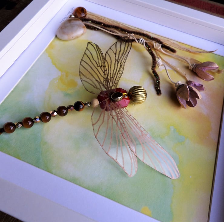 Hello and welcome! This page is home to Beaded Beasties: mixed media box frames of dragonflies and other creatures within an environment. Each one unique, made from new and recycled materials. I hope you love what you see.