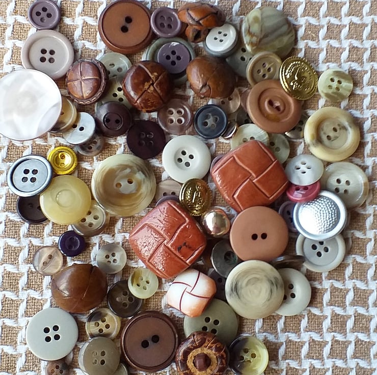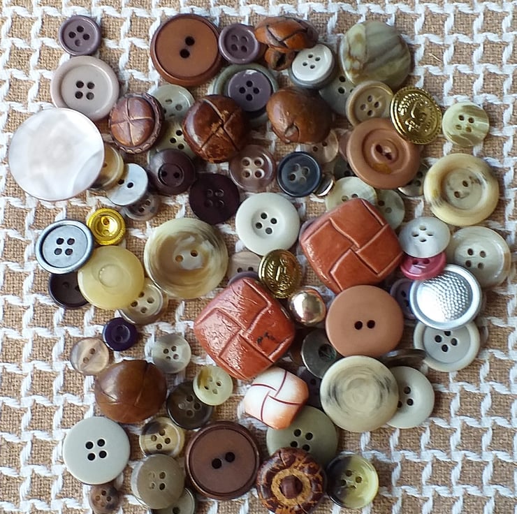 An assortment of recycled brown, fawn, beige and metallic buttons, two hole, four hole and shank. Includes several leather or mock-leather buttons. Weighs approximately 75 gram.
