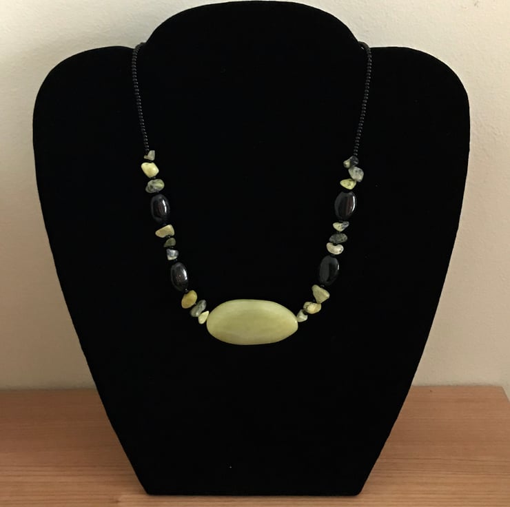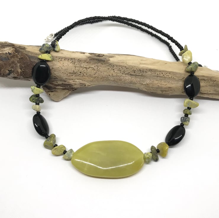 A statement gemstone necklace with Jade, black agate, yellow turquoise chips and black seed beads.