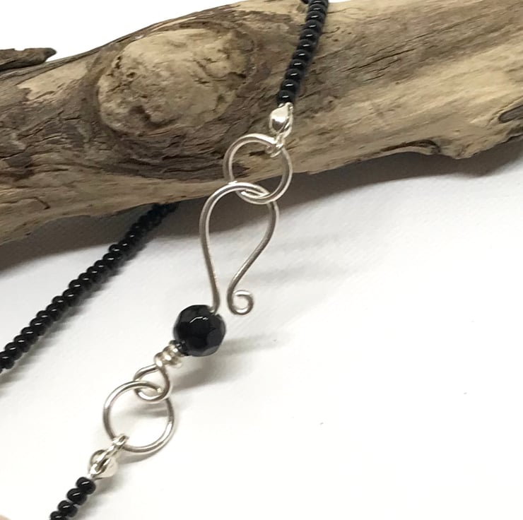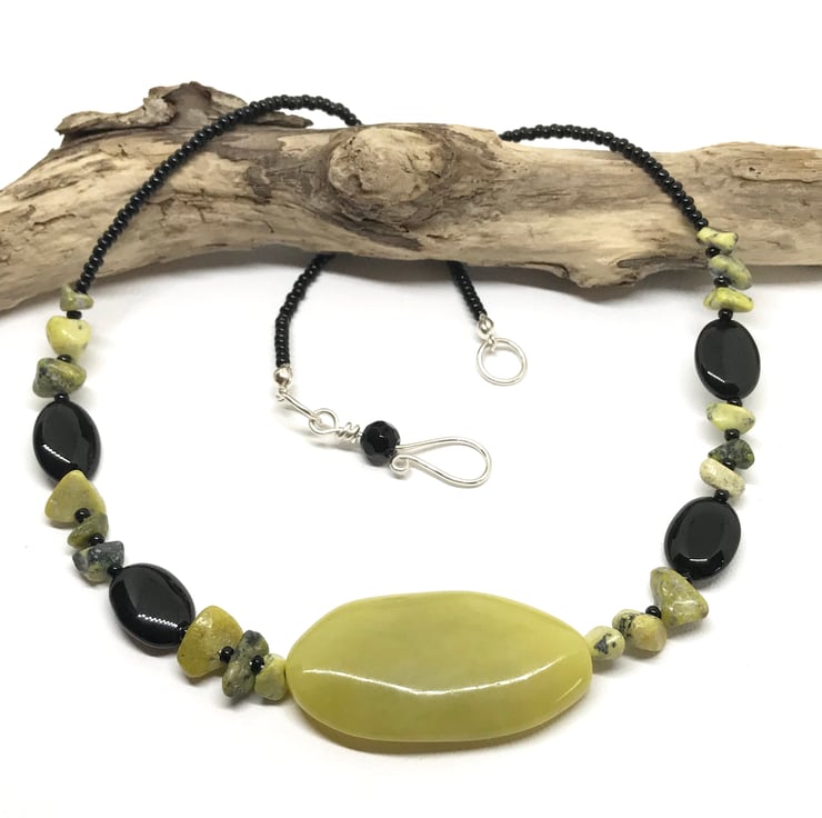 I have selected a beautiful combination of gemstones for this necklace. The center bead is a large jade faceted gemstone measuring approximately 22x35mm, this is accompanied with black agate oval beads, yellow turquoise chips and black seed beads. The fastenings are sterling silver with a handcrafted hook with a black gemstone bead detail.