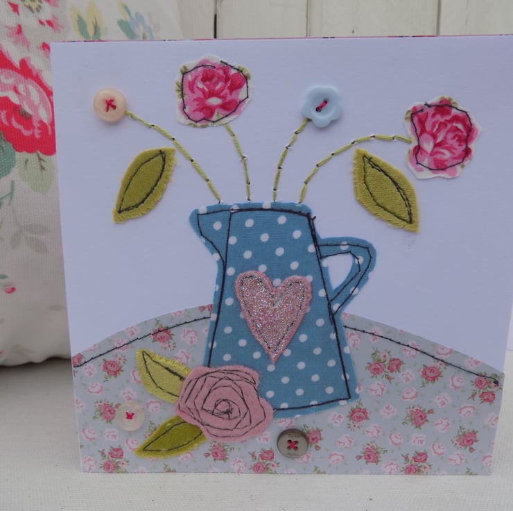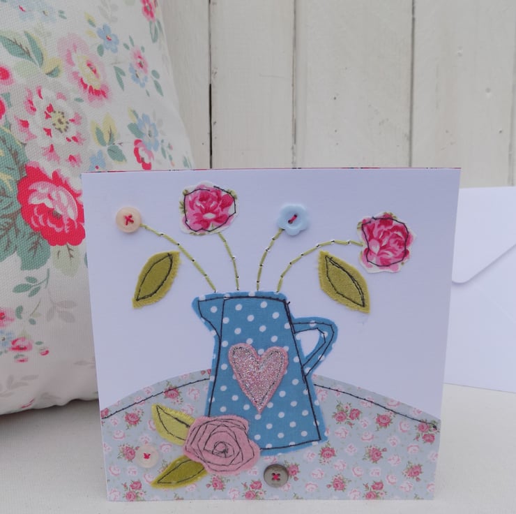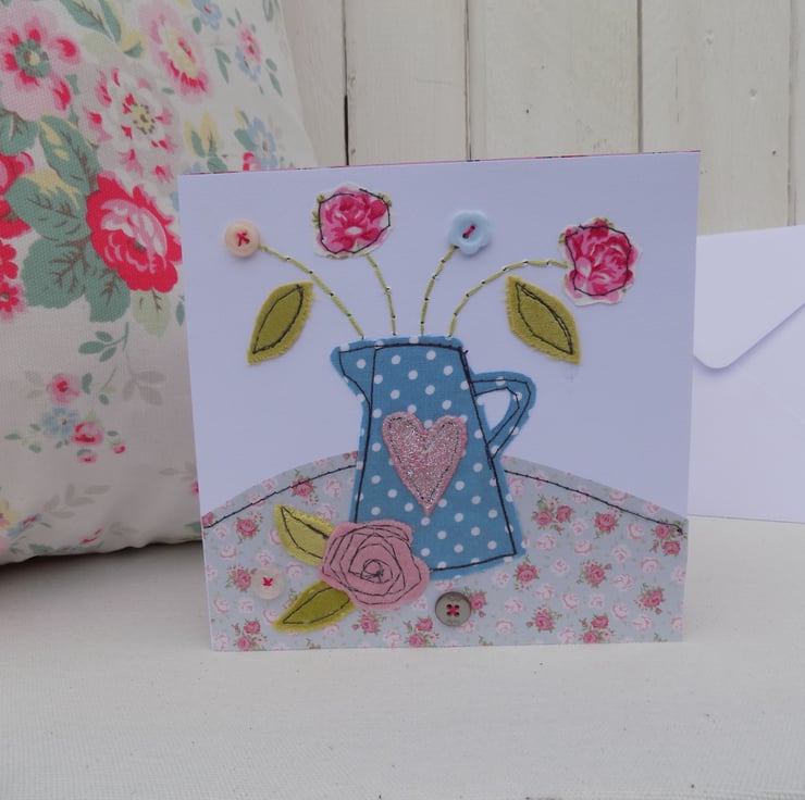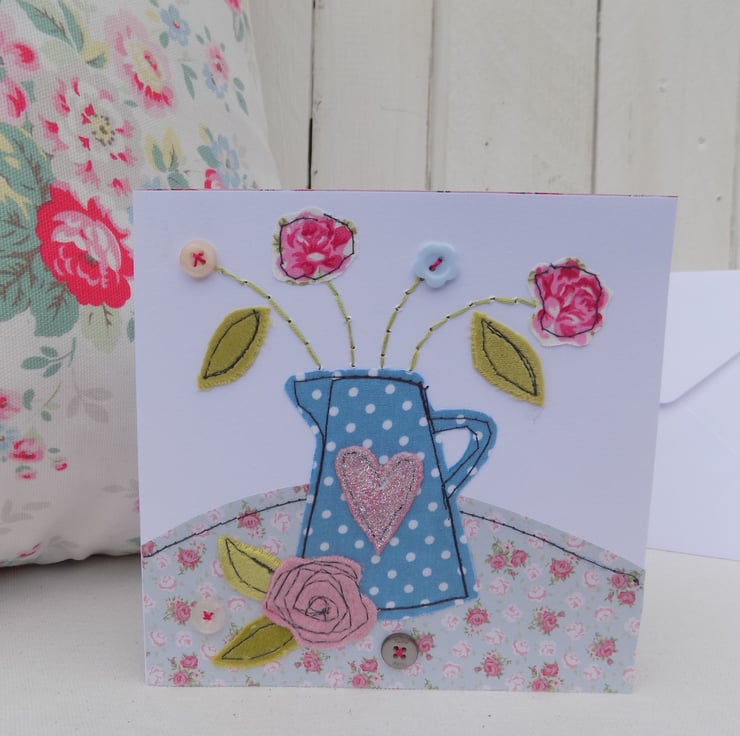 This card has been brought to from life from one of my sketches. It features a blue spotty jug of flowers.
