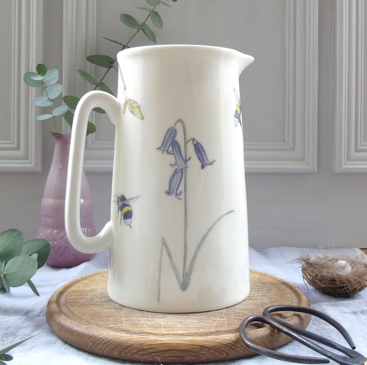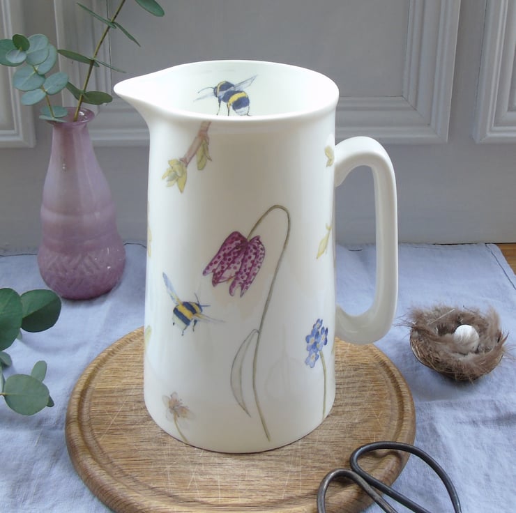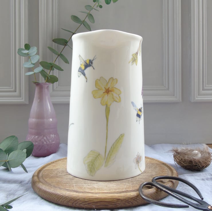 Hand decorated using ceramic transfers of my watercolour paintings of spring flowers and bees. My illustrations are professionally printed onto ceramic transfers, cut and applied by hand onto each jug, making each one unique.