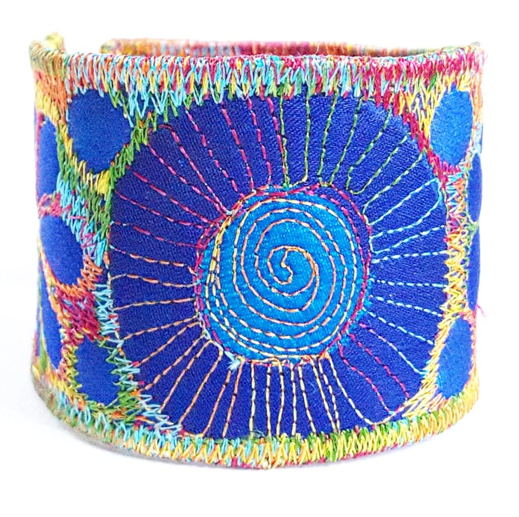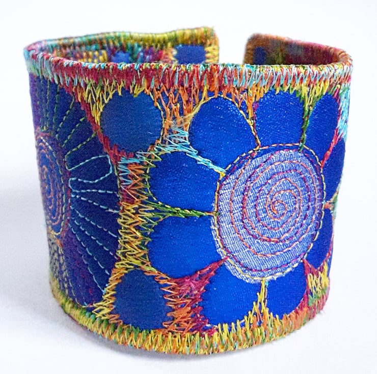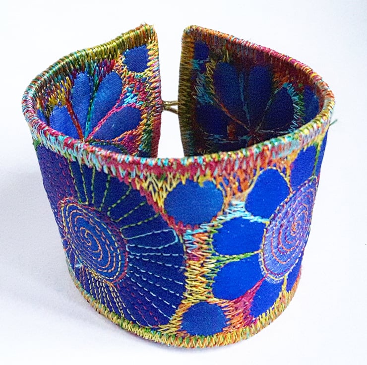 Made from layers of fabric including hand dyed Egyptian cotton and silk fabrics using the free machine embroidery style of sewing