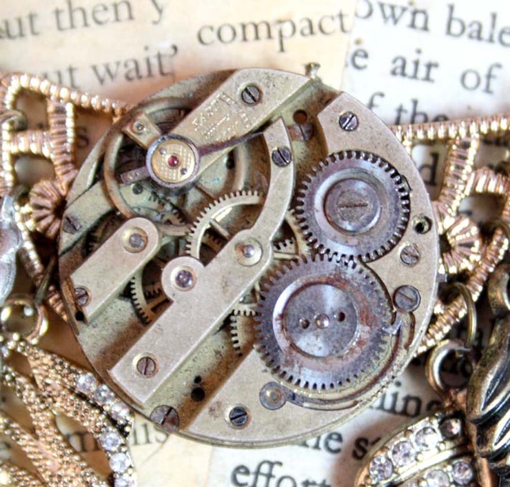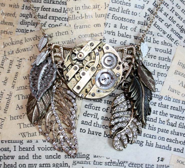 I wanted to make a steampunk inspired take on a traditional dream catcher, An antique gold tone watch movement from a vintage pocket watch has been mounted onto a gold tone finding. An assortment of gold tone, antique gold tone and silver tone feather and leaf charms adorn either side.
