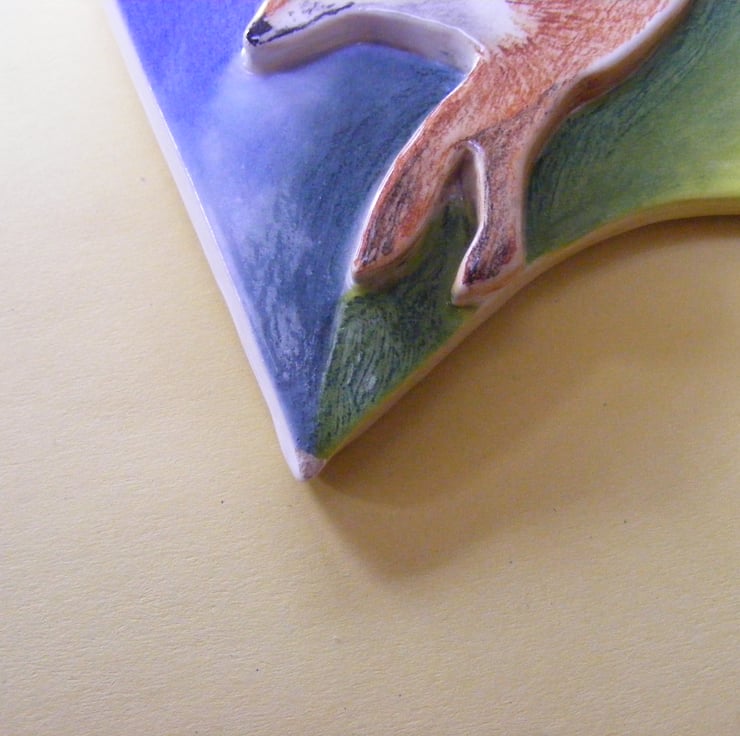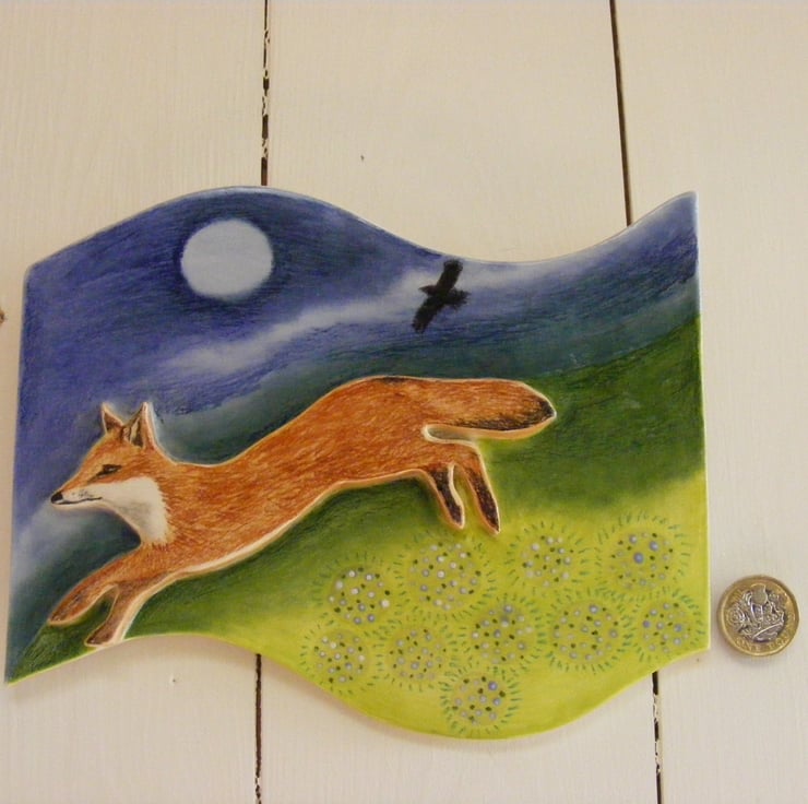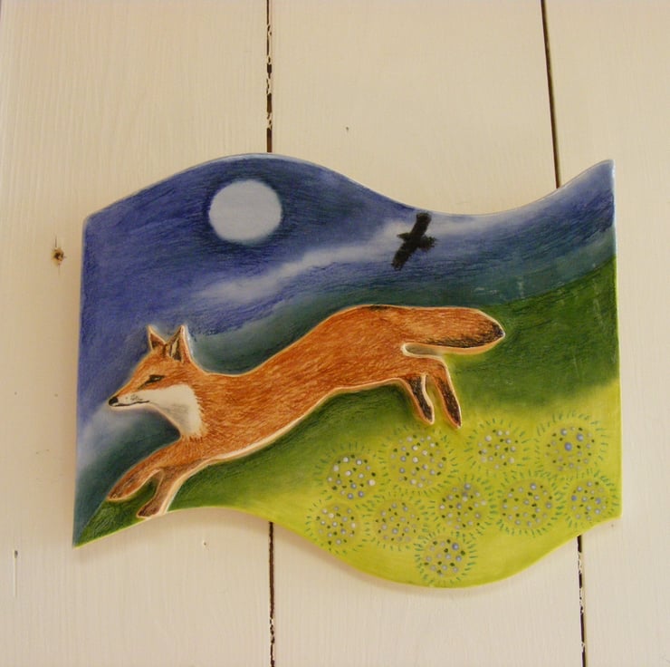 Ceramic one-off original piece, made by myself, using Earthenware clay. Hand-painted and fired in my studio at home. The Fox is in relief and hand cut to my own design. Wall hook attached.