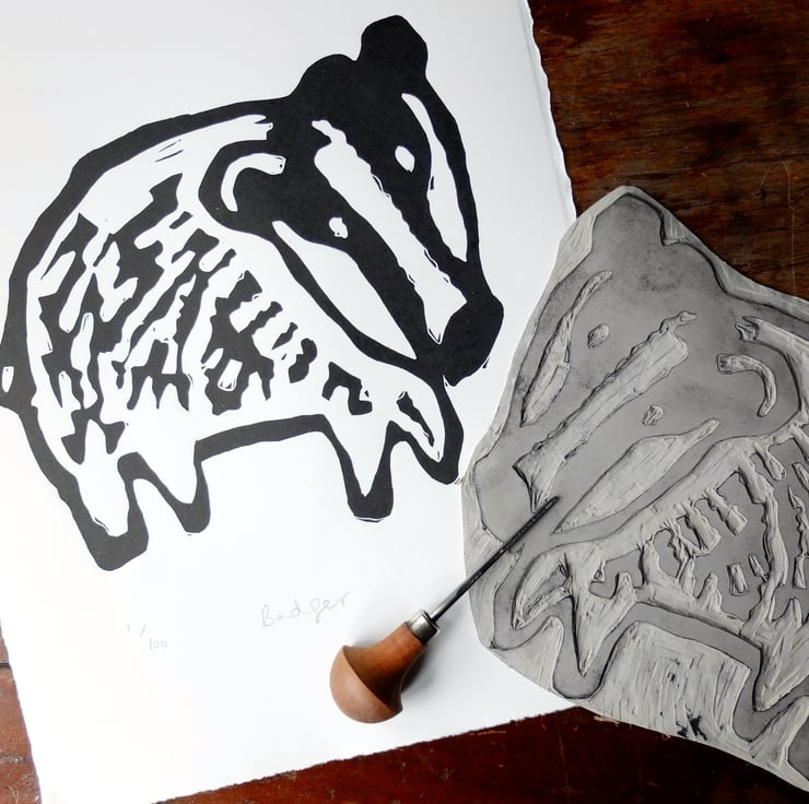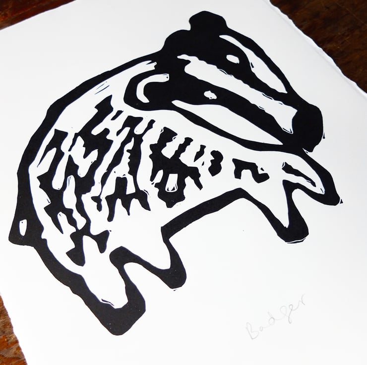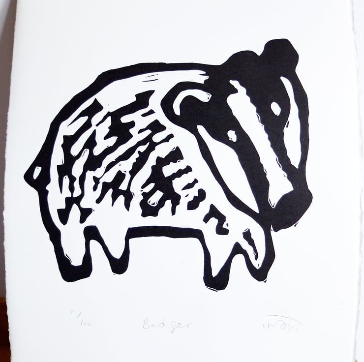 This is a lovely big lino printed Badger! A really bold Badger on a mission.