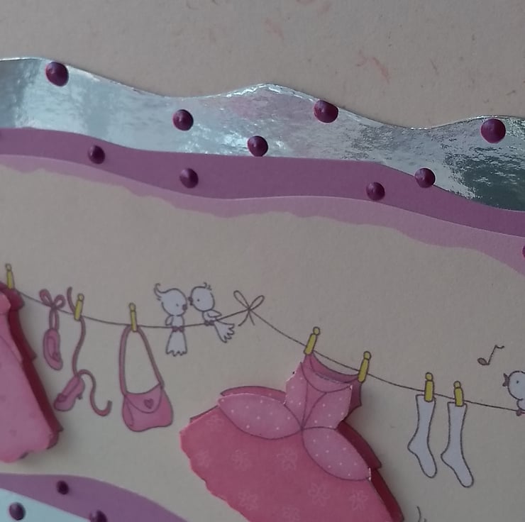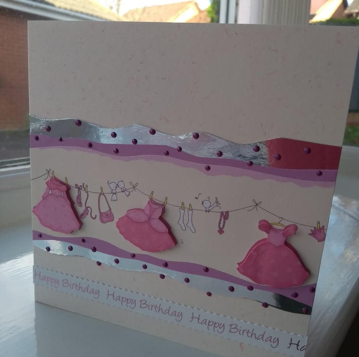 A completely handmade and uniquely designed card. Consisting of a washing line decoupage of pretty dresses and accessories. Mounted onto pink, silver mirri then quality pink flecked cream card. Happy birthday along the bottom. Finished off with pink pearl drops. A space had been left at the top for the child's name and/or age