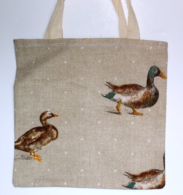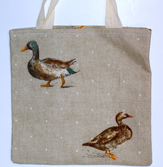The print on this bag has male and female mallards. They are on a brown linen look fabric.