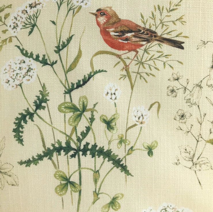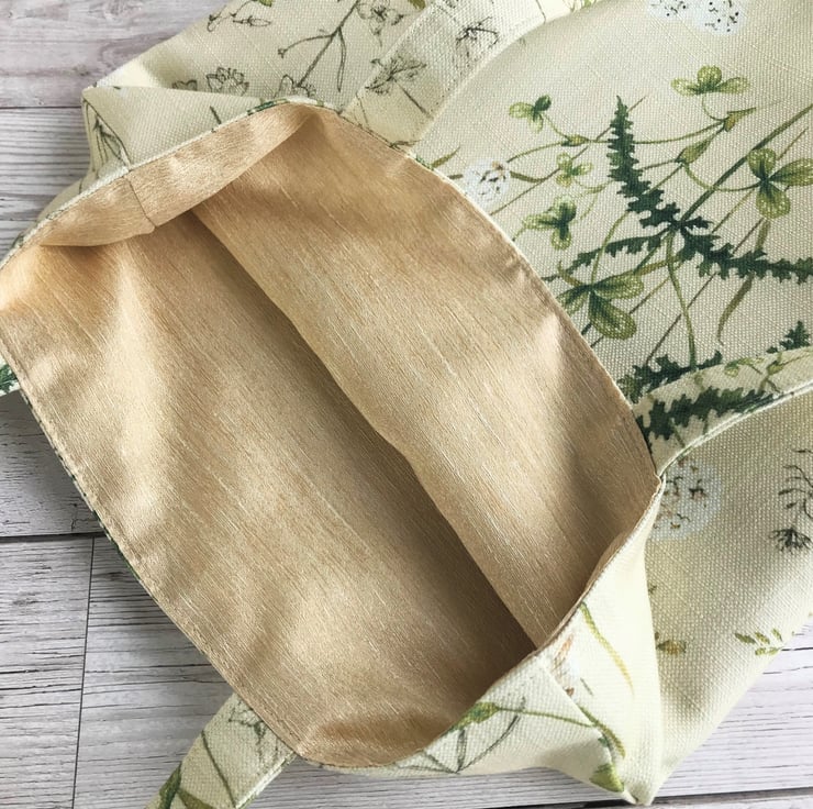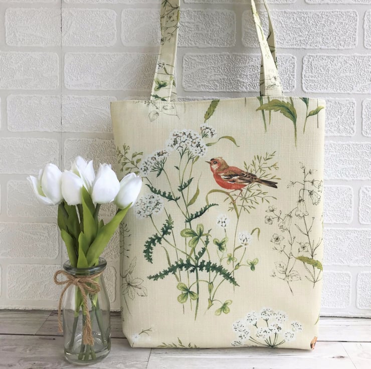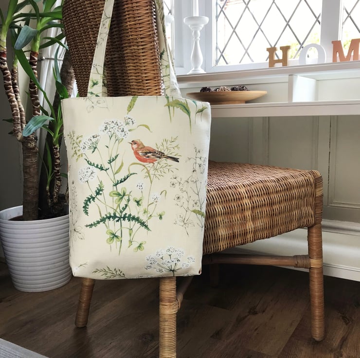 A pretty tote bag in a beautiful print fabric featuring a chaffinch in a meadow on a cream background. The pattern shows a chaffinch perched amongst cow parsley, clover and grasses. The bag is lined with a creamy beige fabric with a slight sheen.