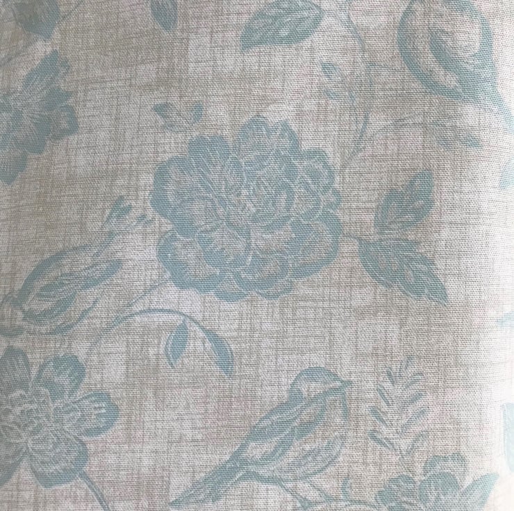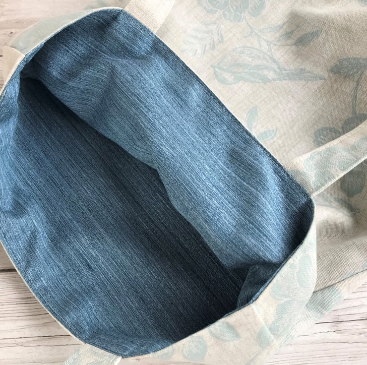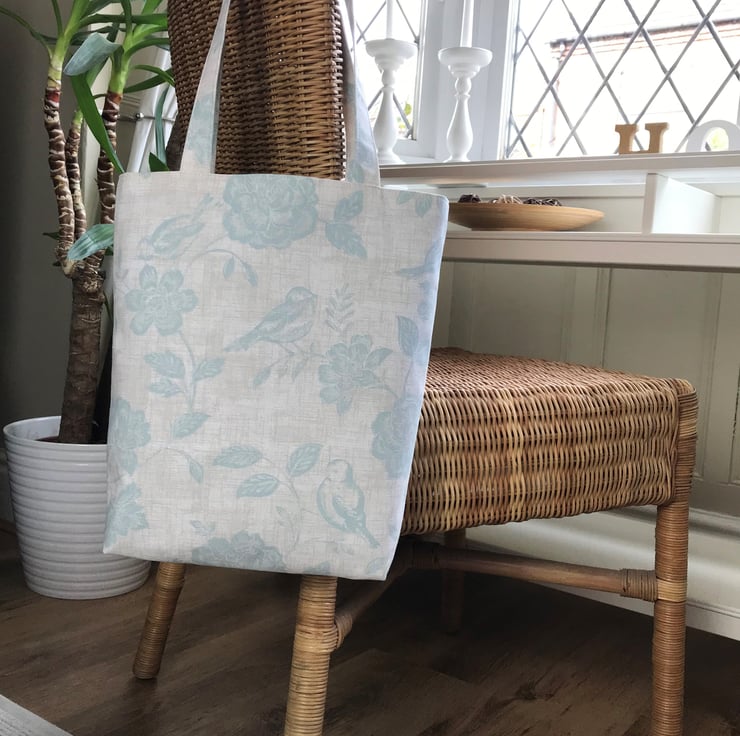 A pretty tote bag in a cream fabric with a beautiful pastel print pattern of garden birds and flowers in a very pale duck-egg blue. The bag is fully lined with blue fabric with a slight sheen.