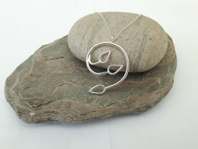 I have made this elegant pendant from sterling silver round wire formed into a spiral curve with three open leaves soldered onto it. I have added a jump ring at the top to act as a bail for attachment to the chain. A barrelling machine has been used to harden the metal and polish it to a high shine.