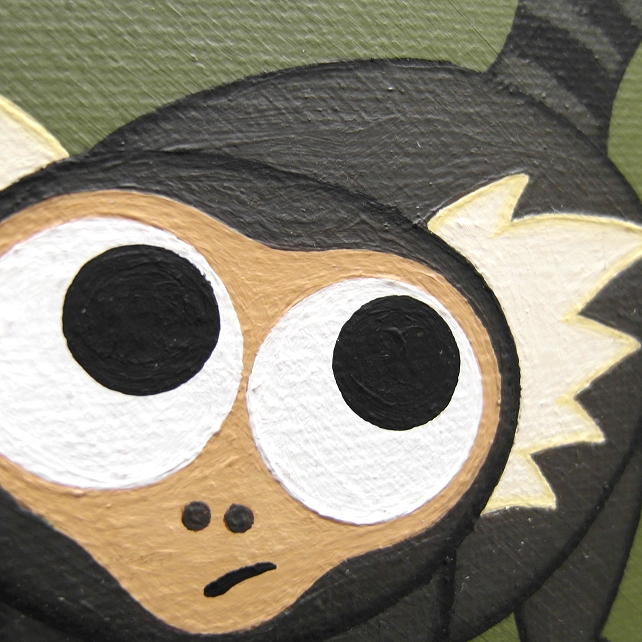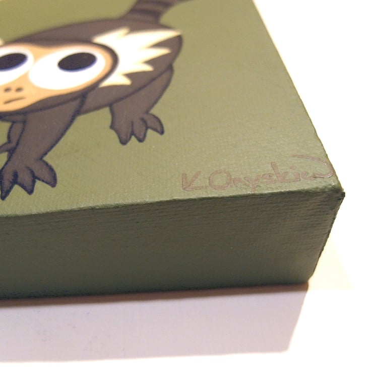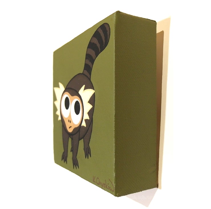 A small painting of a cute marmoset monkey stood on an olive green background, its stripey tail in the air as it looks around with big wide eyes.