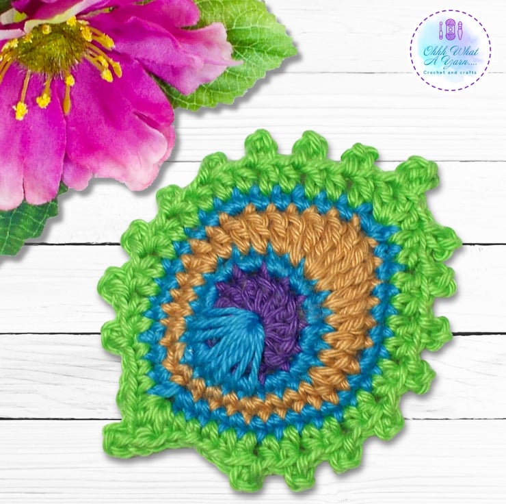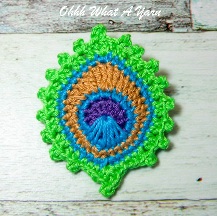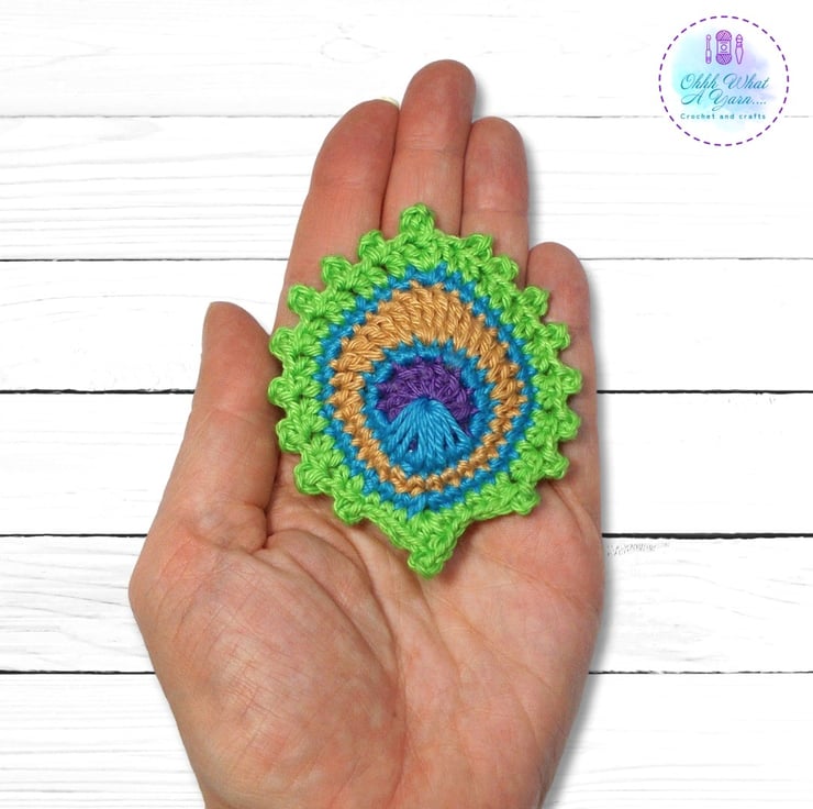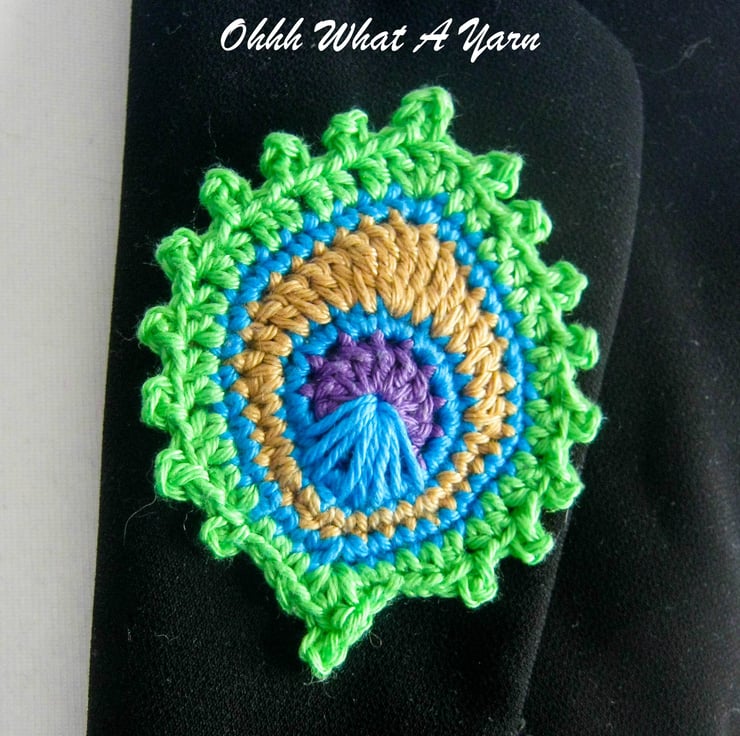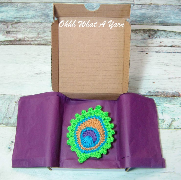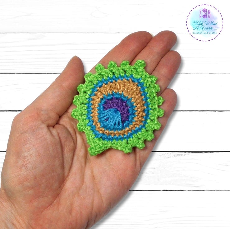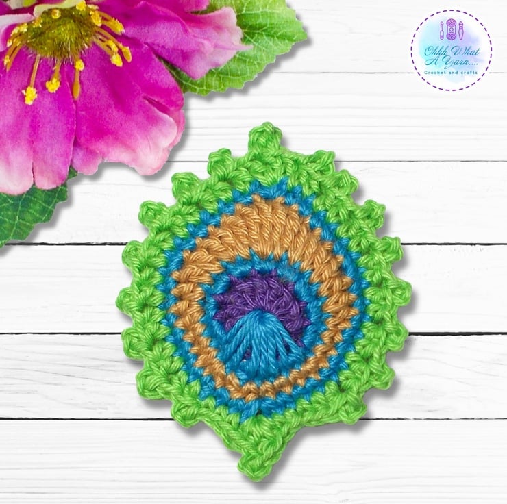 This stylish peacock feather brooch has been crocheted using Scheepjes Catona mercerised cotton yarns which give it a lovely sheen and stitch definition.