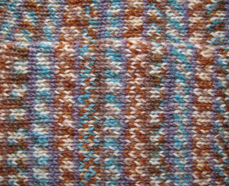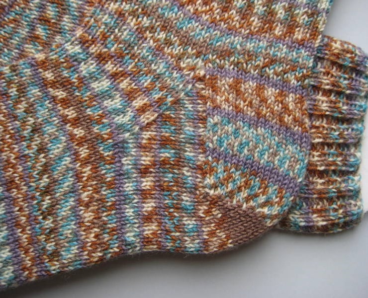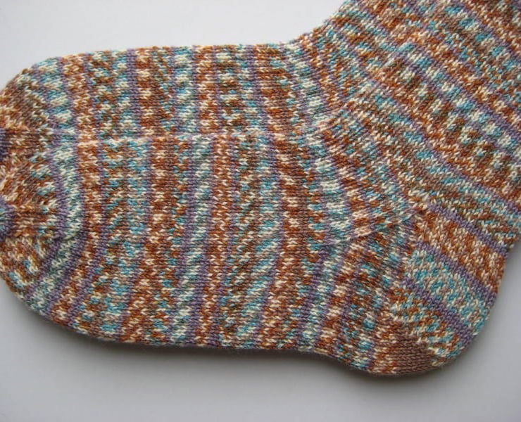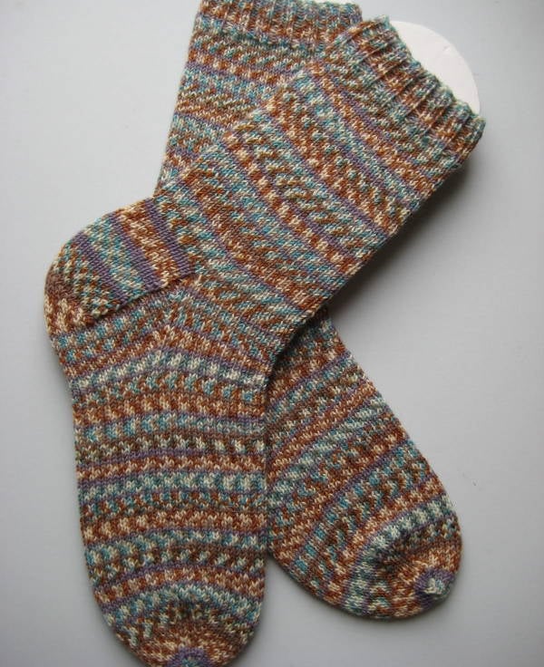 Hand knitted socks made from Regia 4 ply self patterning sock yarn, 75% wool 25% polyamide in shades of tan, beige, blue, lilac and cream. Warm and durable, these socks will keep your feet comfortable throughout the year..