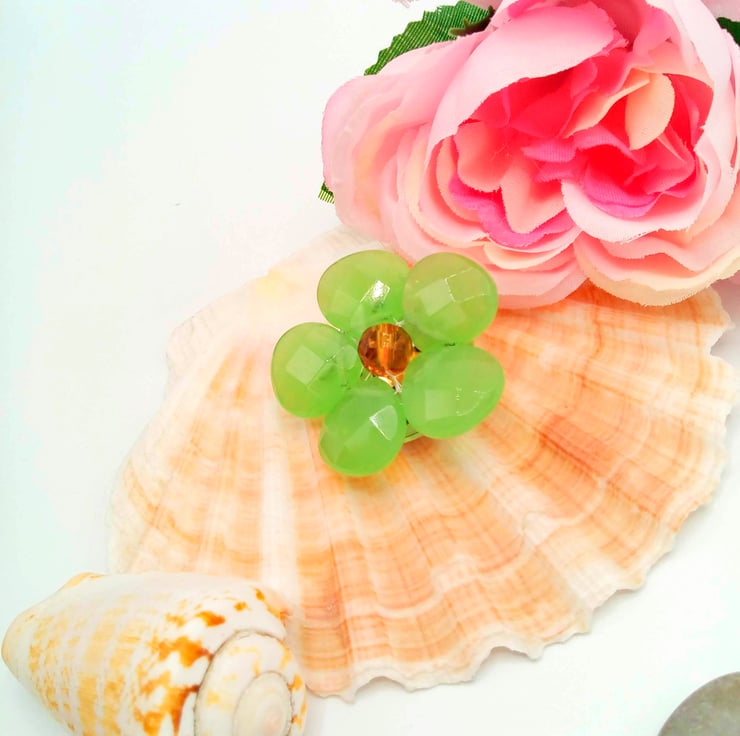 This striking green beaded flower brooch would look great with any of your Spring or Summer outfits for a day out or and evening with friends. It would also make a lovely gift for a friend or relative for a birthday or to say Thank You, or a lovely treat for yourself. It is made by joining opaque green faceted tear drop shaped beads to form the flower shape with a topaz coloured crystal bead at the centre. This is then attached to the silver plated brooch base. The brooch is approx. 40 mm in diameter. The brooch will be dispatched wrapped in tissue paper in an organza bag and delivered to you via Royal Mail first class post.