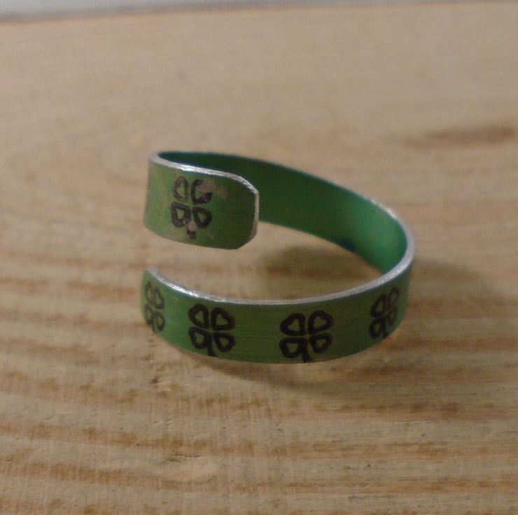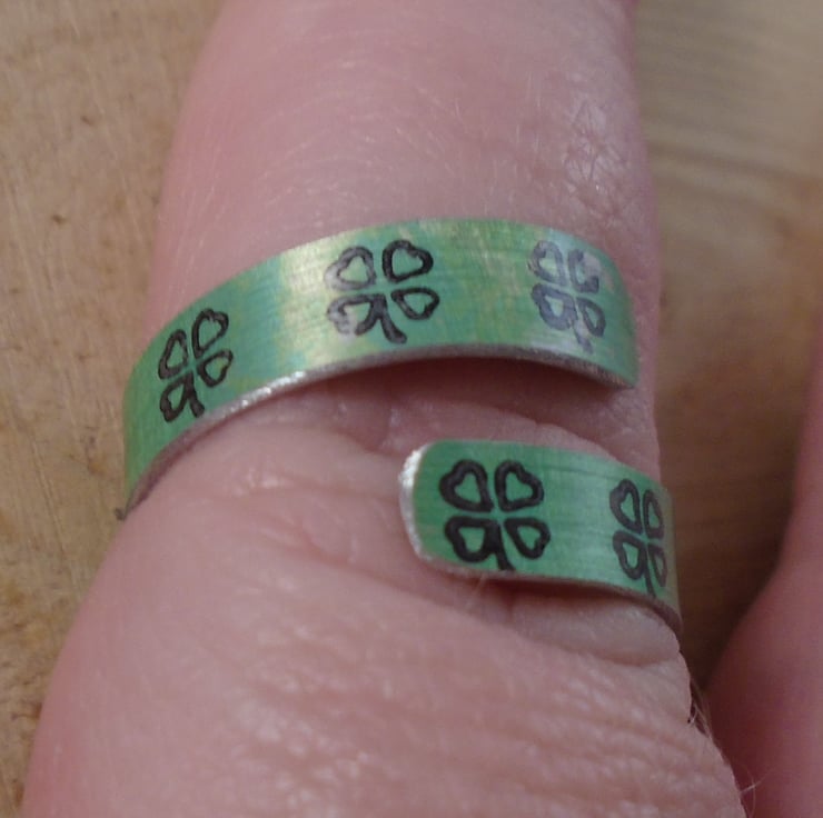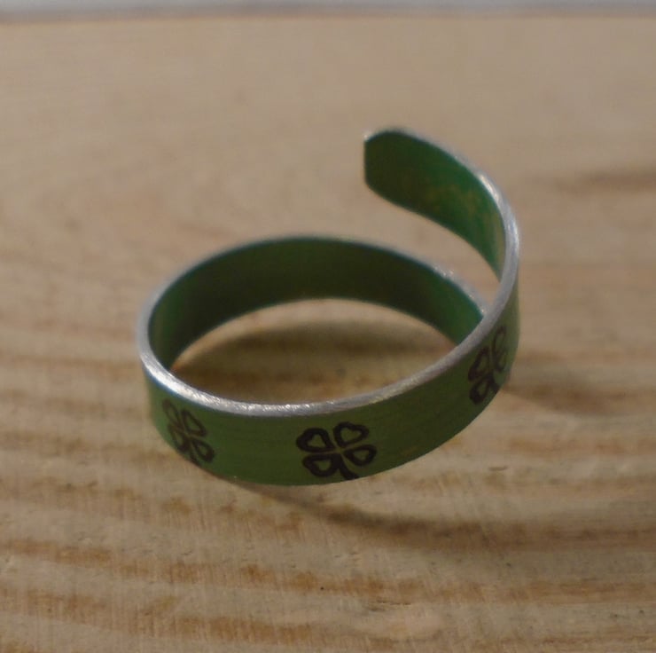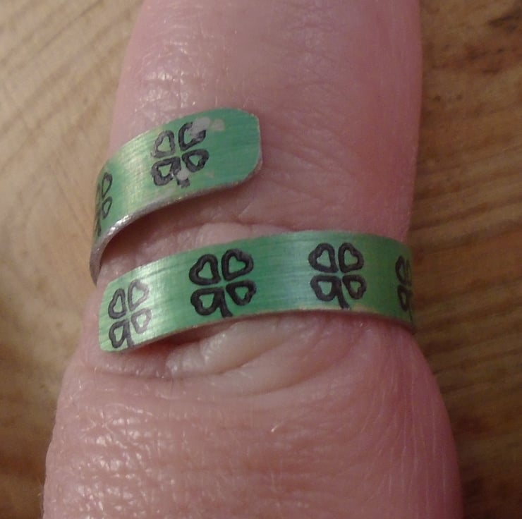 A simple, lucky clover ring, hand made from anodised aluminium. A thin strip of aluminium has been hand cut and dyed green. It has then been stamped all over with lucky clovers in black. It has then been bent around a mandrel to form the ring.