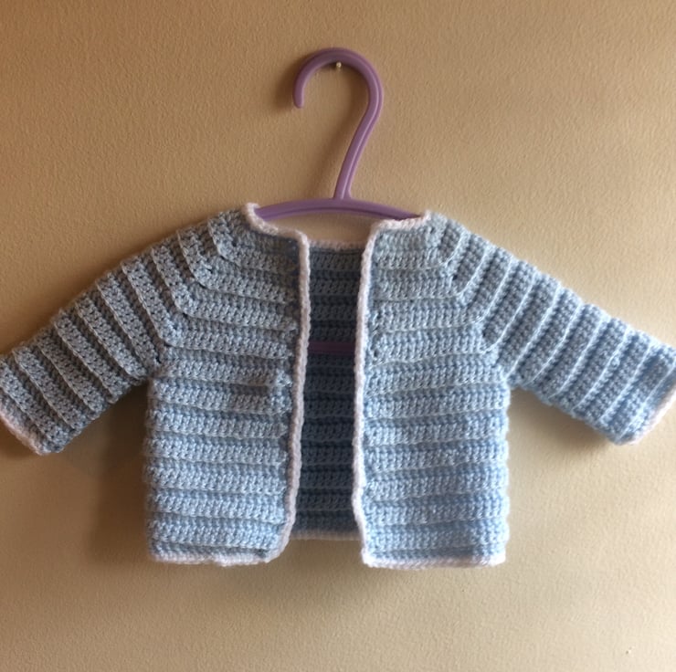 A lovely crocheted Baby Cardigan. Ridge pattern. Blue with white borders