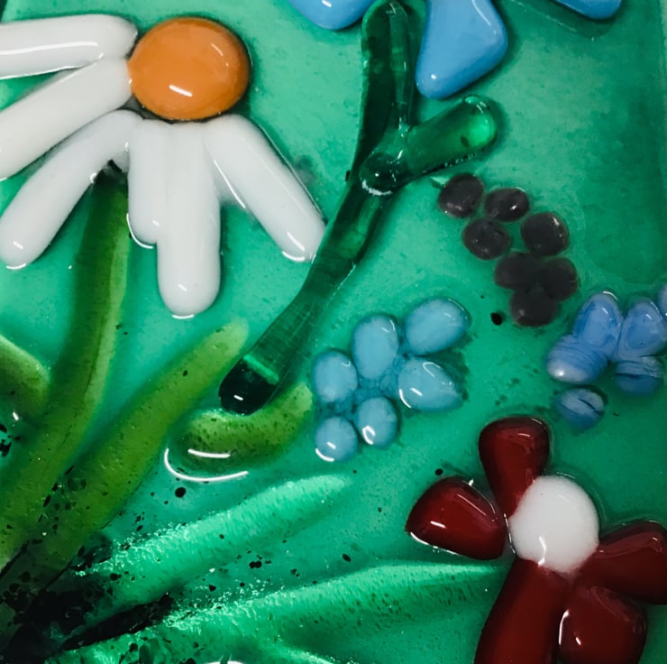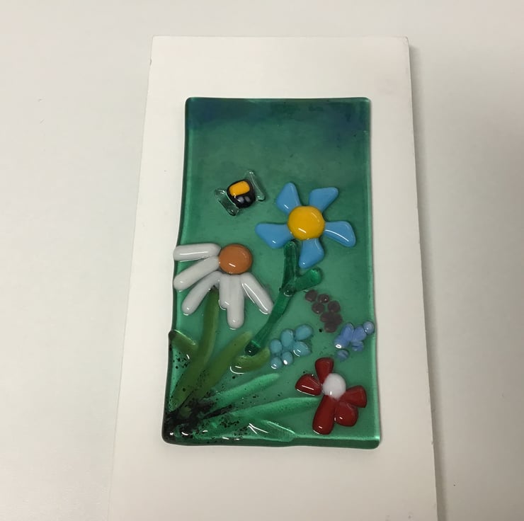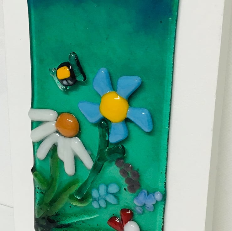 A detailed floral picture with a contemporary twist . Approximate size is 7inch x 4 inch. The fused glass picture is mounted onto white painted mdf board with a hook on the back for easy hanging