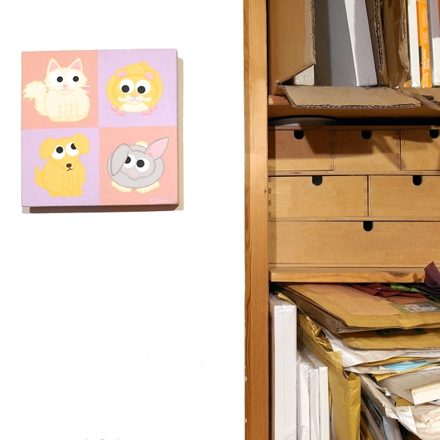 This cartoon animal art is painted in acrylics on a 25cm x 25cm and 3.5cm deep canvas (9.8" x 9.8" and 1.4" deep). The squares carry on over the edges so there is no need for framing, and a string is attached to the back so it is ready to hang. The pet canvas will be sent signed for.