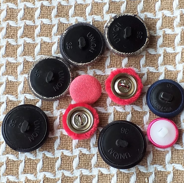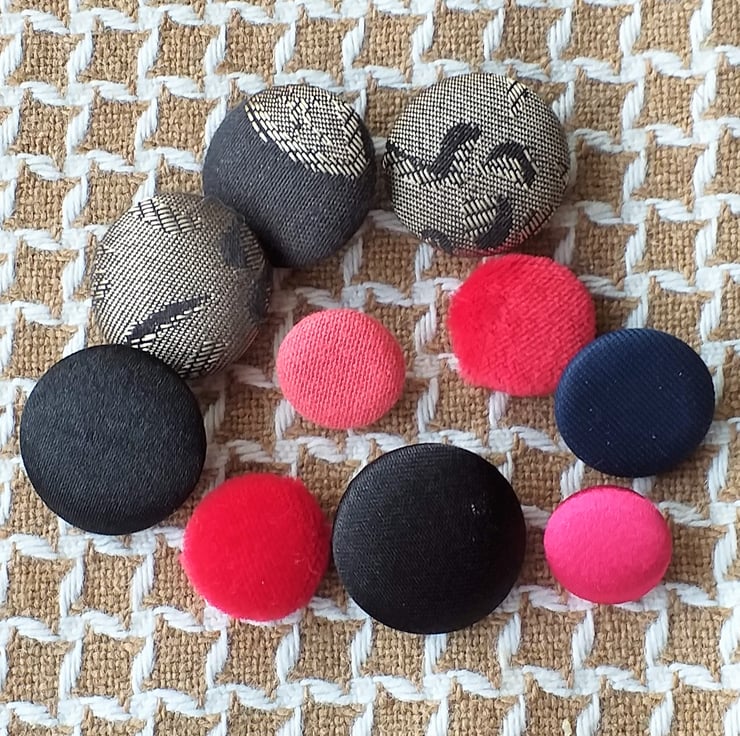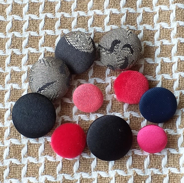 Here are ten assorted recycled fabric-covered buttons of various sizes, the largest approximately 2 cm.in diameter, and the smallest half that. The two red ones are covered in velvet and the bright pink and the two plain black ones in satin.