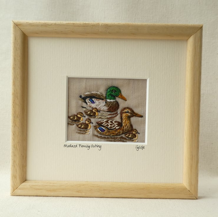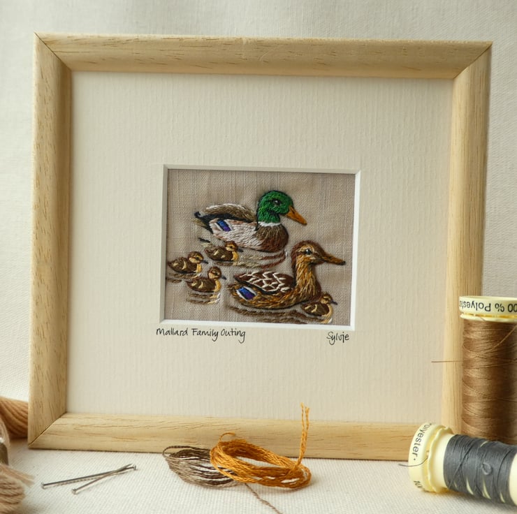 The stitched piece is about 5 x 6cms and the whole item is approx 14 x 15cms. It is framed behind glass with a simple untreated wooden frame for display and protection and is ready to hang.