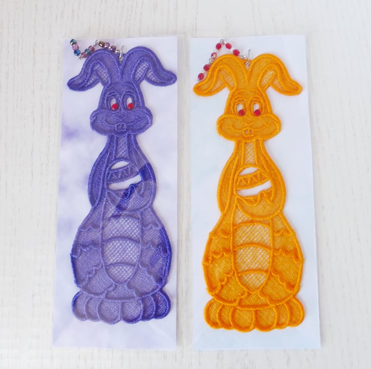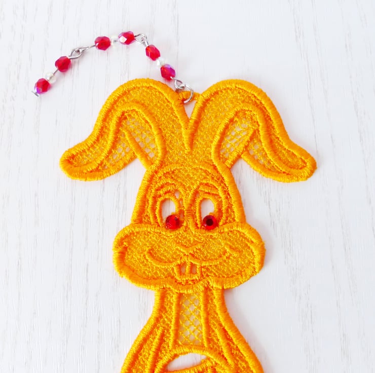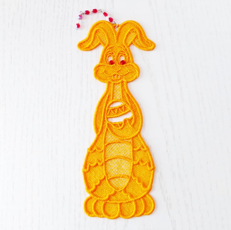 Cheeky Easter Bunny bookmark with sparkly eyes and a bead charm. Bunny is holding an Easter egg.
