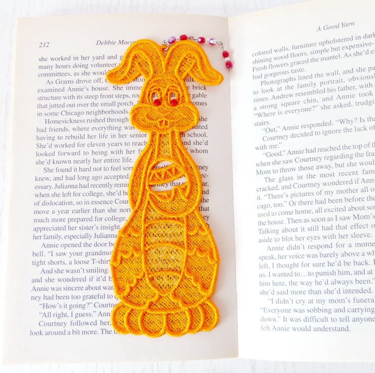 Cheeky Easter Bunny bookmark with sparkly eyes and a bead charm. Bunny is holding an Easter egg.