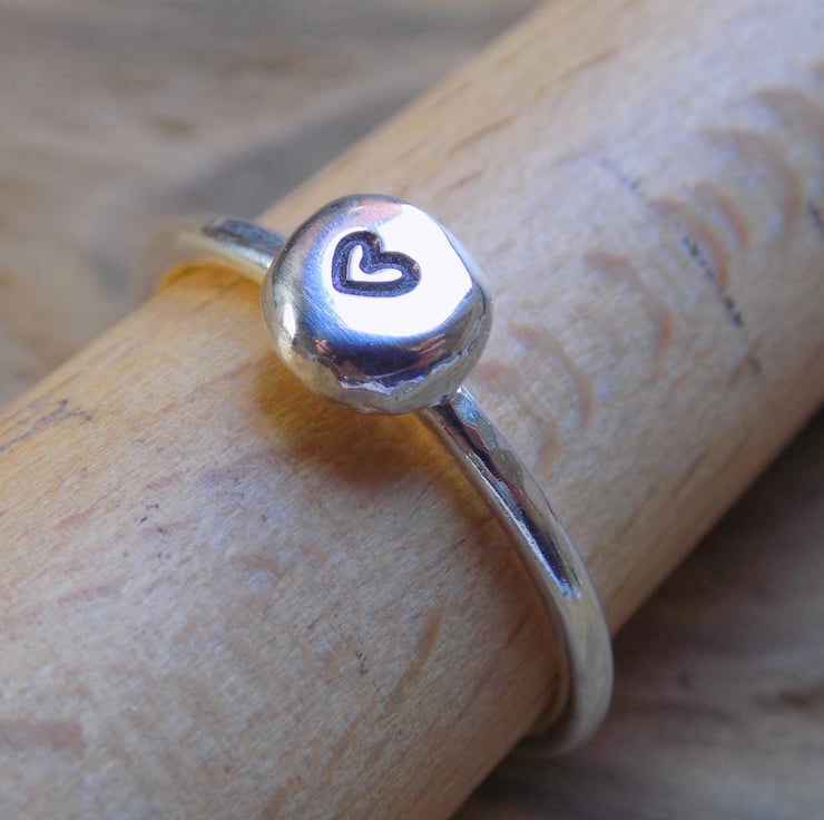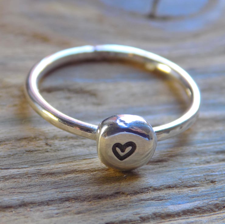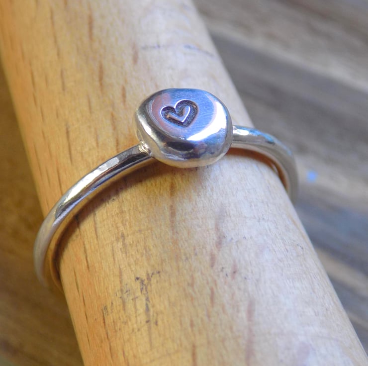 A ring made from off cuts of sterling silver which have been melted down, shaped, sanded and polished to a high shine. Stamped with a tiny heart and soldered onto a 1.5 mm hammered ring shank.