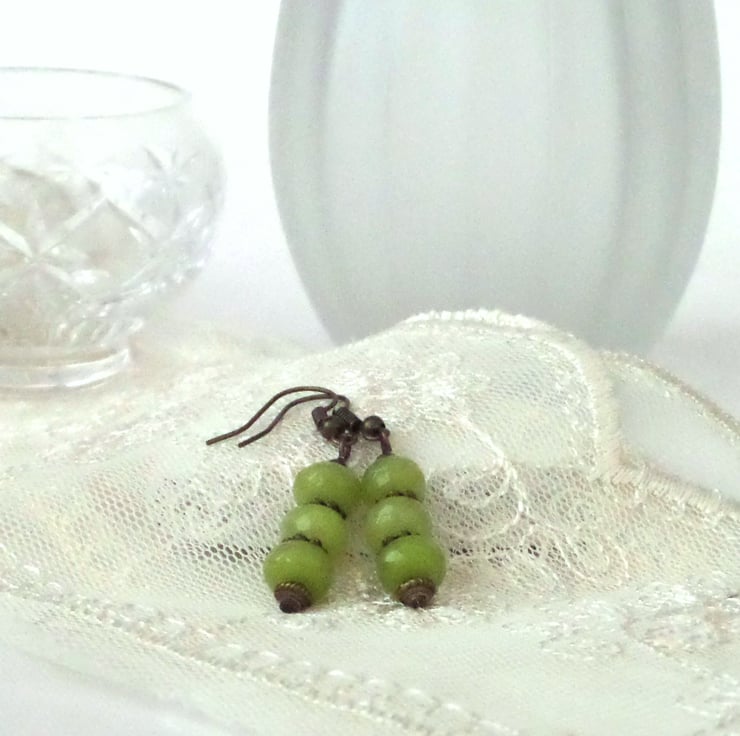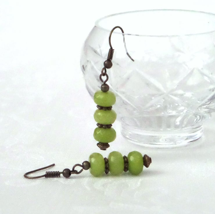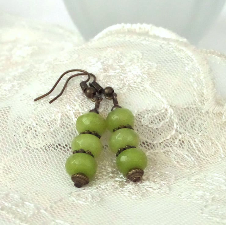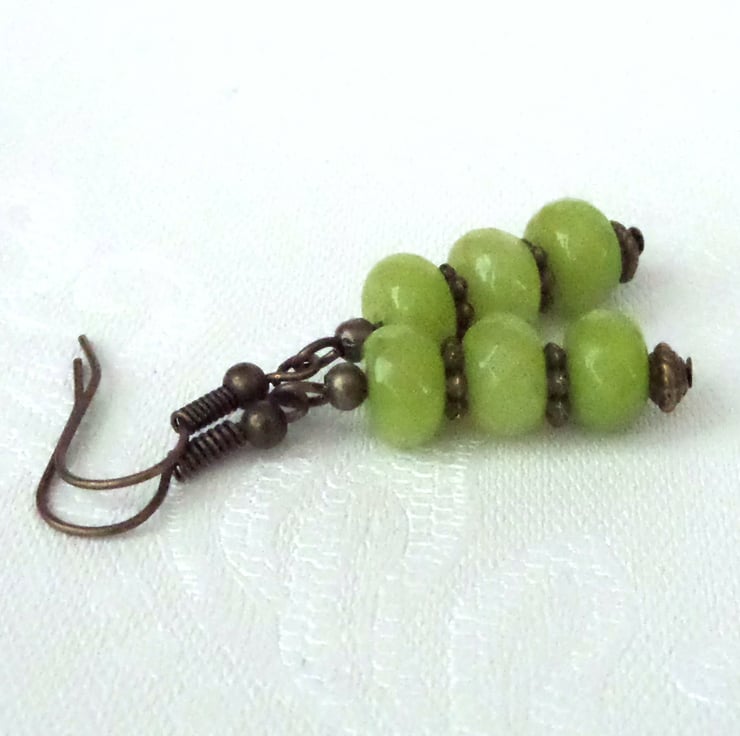 Three jade rondelles hang with bronze 'daisy' beads from bronze wires in these pretty dangly earrings.