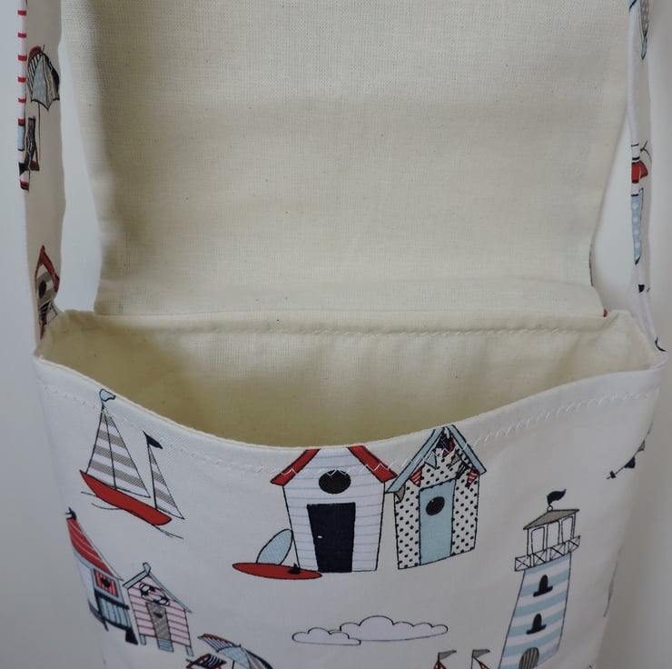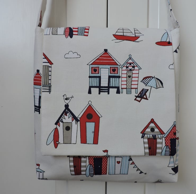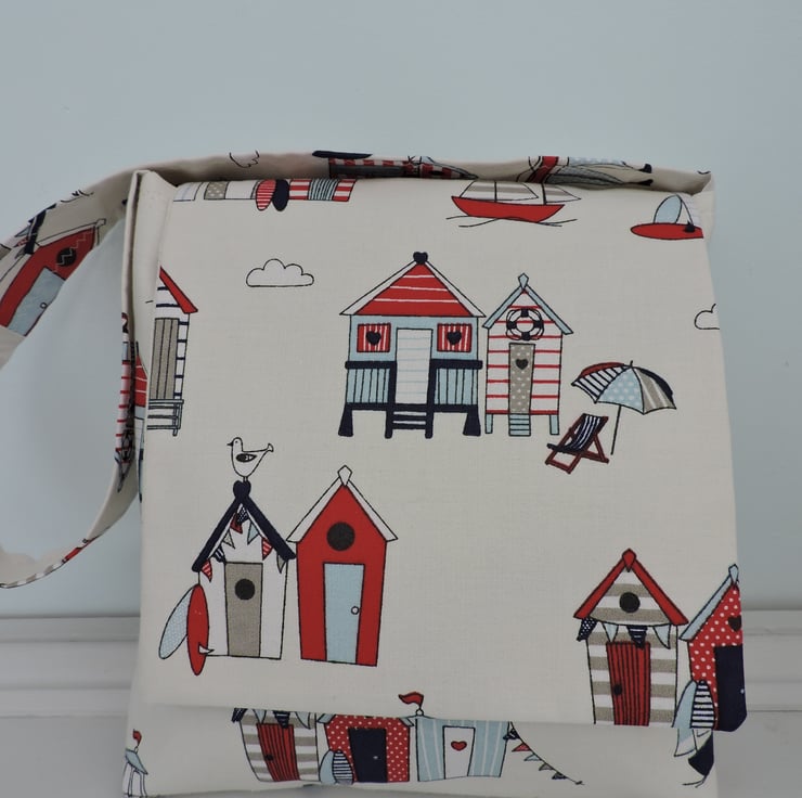 This simple little handbag is made with a seaside themed cotton fabric in red, blue and white, depicting yachts, beach huts, deckchairs and umbrellas.