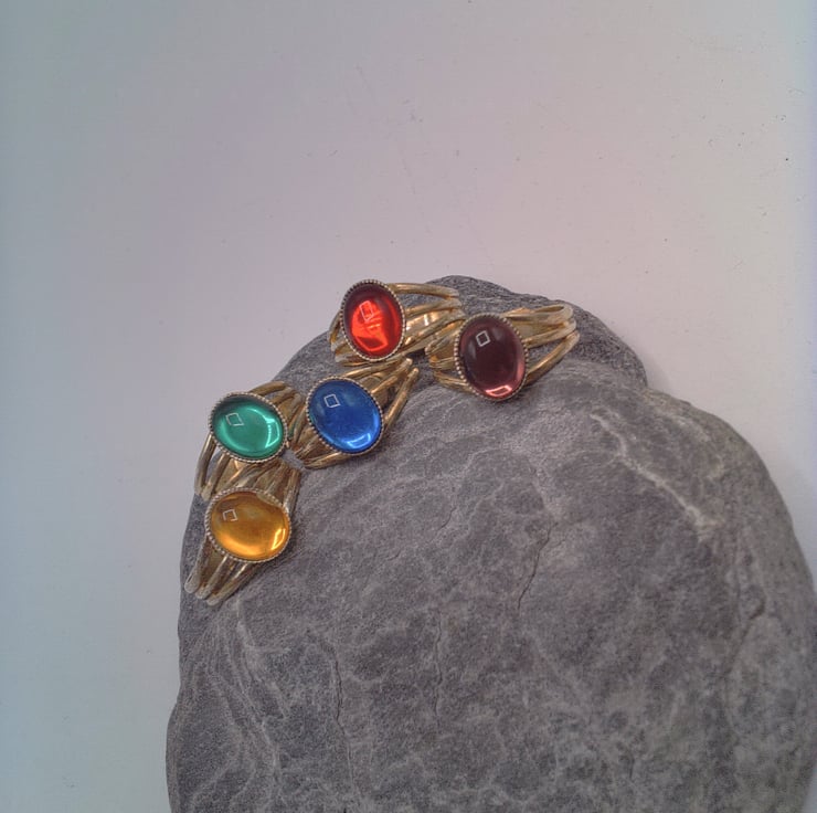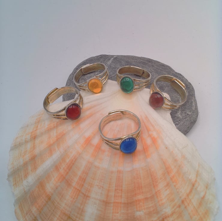 These very pretty adjustable ladies ring would make an ideal gift for a friend or relative for a birthday or or anniversary, or a lovely treat for yourself. They would go well with any of your Spring or Summer outfits for a day out, a casual evening out or for everyday wear. The silver plated ring base is adjustable so will fit most sized fingers and it has a small 6 mm x 3 mm cabochon stone. The colour choices for both the rings are as follows:
