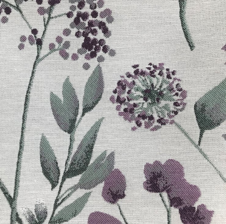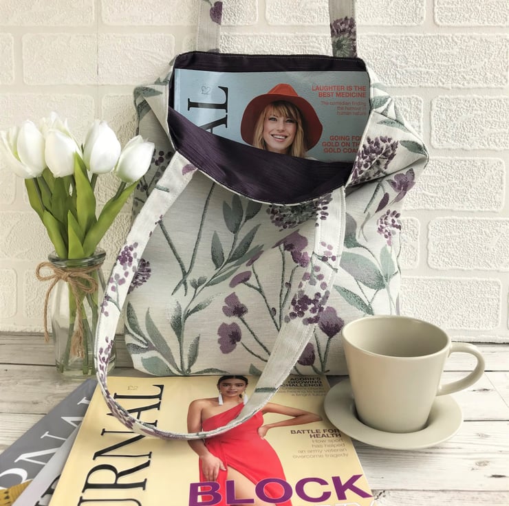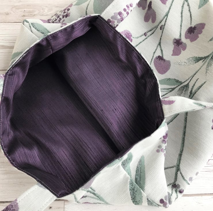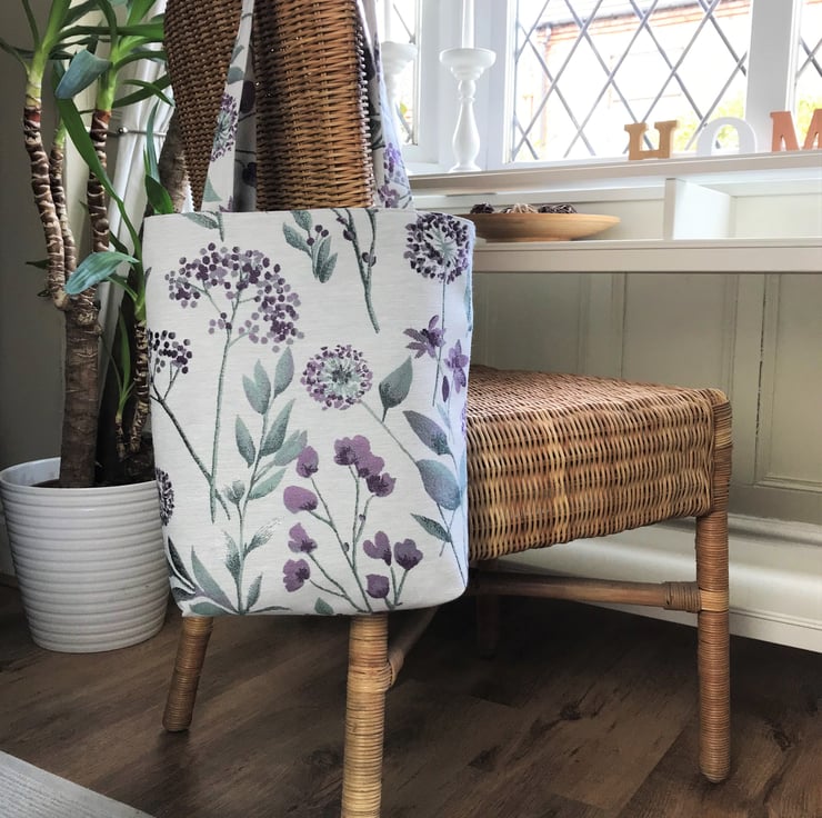 A pretty tote bag in a beautiful floral fabric. The fabric has a woven pattern featuring purple alliums and other purple flowers, with jade green leaves on a cream background. The bag is fully lined with purple fabric with a slight sheen, which exactly matches the purple of the flowers in the outer fabric.